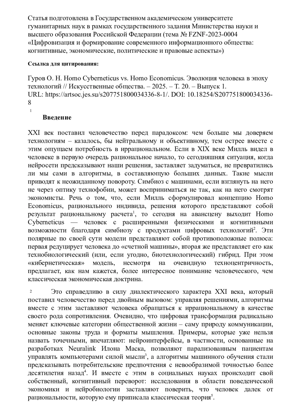 В статье исследуется диалектика человеческой природы в эпоху цифровых технологий. С этой целью в работе противопоставляются классическая модель Homo Economicus, рационального агента, для которого существование сведено к комплексу факторов экономической природы, и концепт Homo Cyberneticus. Данный концепт возникает из симбиоза человека с алгоритмами, в рамках которого продукты технологий из внешних инструментов превращаются в составляющую когнитивных процессов. Автор доказывает, что нейроинтерфейсы, ИИ и блокчейн, вопреки мнению технофобов, актуализируют вопросы свободы и смысла, превращая человека в «процесс» самоопределения. Ключевой парадокс: алгоритмы, угрожая автономии, одновременно усиливают человечность. Вывод, который делает автор, заключается в том, что технологии не заменяют, а переопределяют человеческое, и в этом смысле Homo Cyberneticus представлен как «процесс» переосмысления целей и ценностей. В таком контексте технологии не заменяют, а напротив, усиливают человеческое, превращая вызовы в инструменты самопознания и развития.