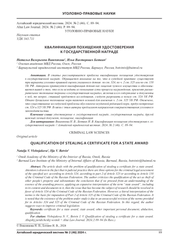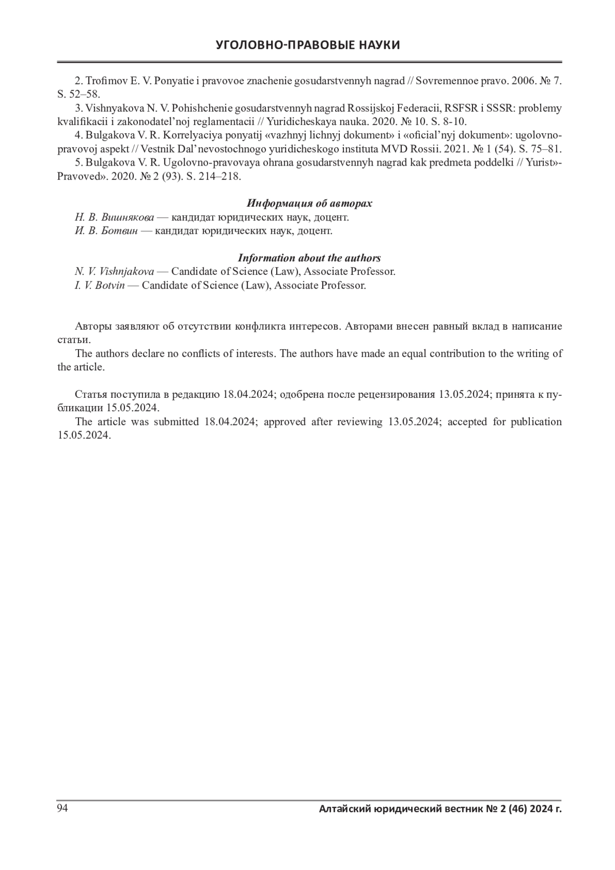 3. Вишнякова Н. В. Похищение государственных наград Российской Федерации, РСФСР и СССР: проблемы квалификации и законодательной регламентации // Юридическая наука. 2020. № 10. С. 8-10. EDN: HBKNMW