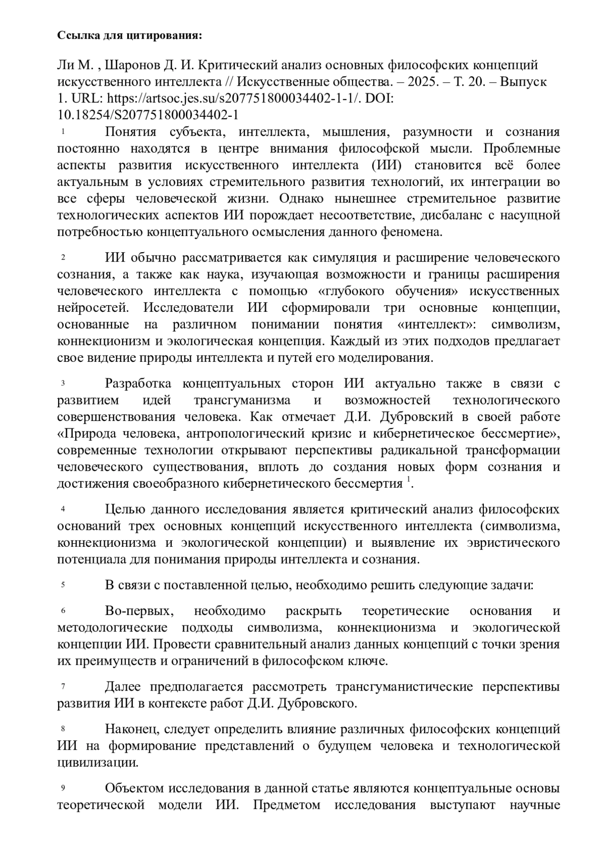 Понятия субъекта, интеллекта, мышления, разумности и сознания постоянно находятся в центре внимания философской мысли. Проблемные аспекты развития искусственного интеллекта (ИИ) становится всё более актуальным в условиях стремительного развития технологий, их интеграции во все сферы человеческой жизни. Однако нынешнее стремительное развитие технологических аспектов ИИ порождает несоответствие, дисбаланс с насущной потребностью концептуального осмысления данного феномена.