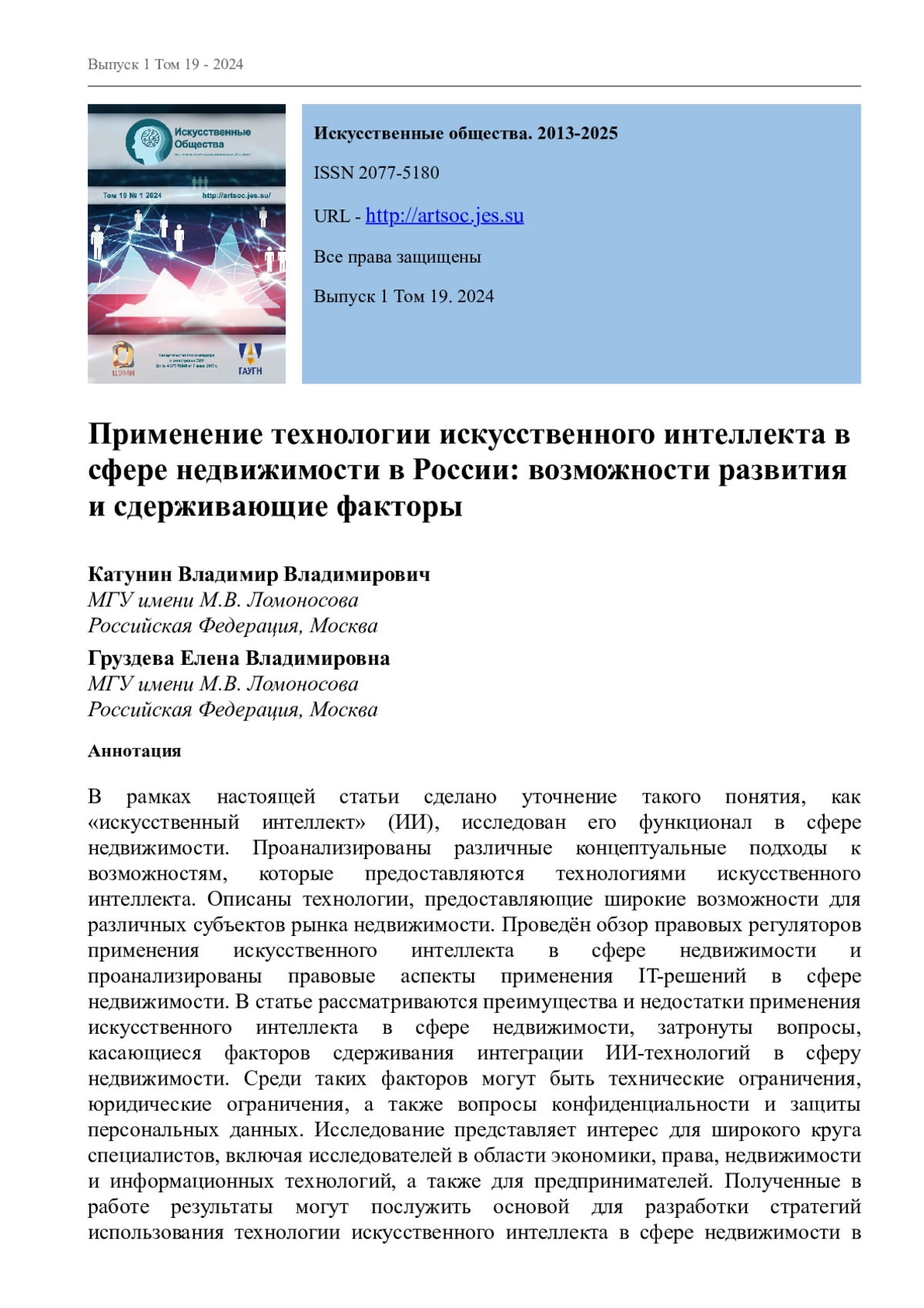 Развитие научно-технического прогресса (НТП) и интеграция инновационных продуктов во все сферы человеческой деятельности не обходят стороной сферу недвижимости. Одним из востребованных продуктов НТП в сфере недвижимости на сегодняшний день признан искусственный интеллект (ИИ), который представляет собой компьютеризированную систему, способную анализировать информацию и решать задачи аналогично тому, как это делает человек [14]. В научной литературе ИИ сопоставляется с искусственной когнитивной системой человека [7], т. е. он, подобно человеку, способен к самоуправлению, саморазвитию и самосовершенствованию, что и делает его высоковостребованным в тех сферах деятельности, где многое зависит от человеческого фактора.
