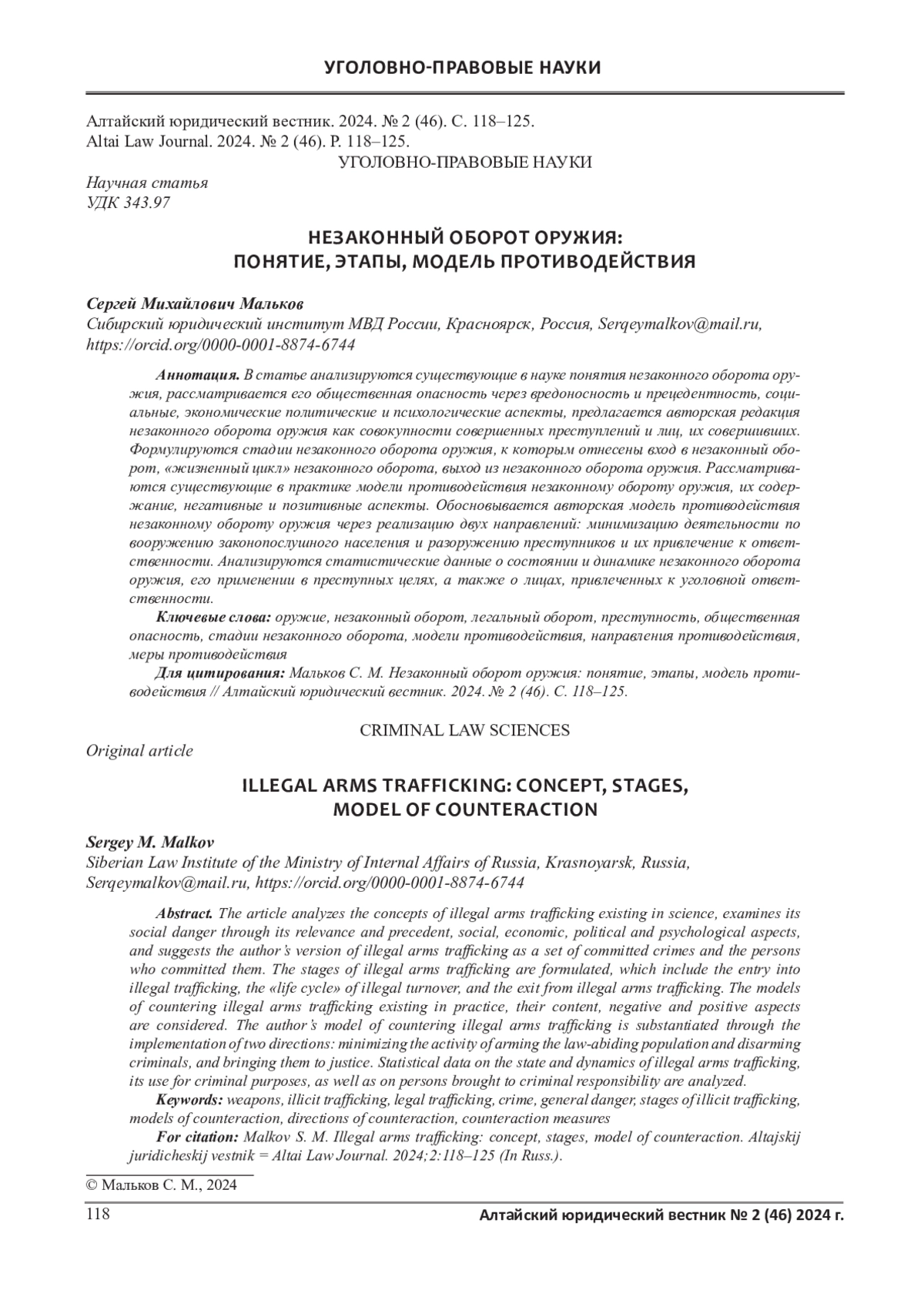 Формулируются стадии незаконного оборота оружия, к которым отнесены вход в незаконный оборот, «жизненный цикл» незаконного оборота, выход из незаконного оборота оружия.