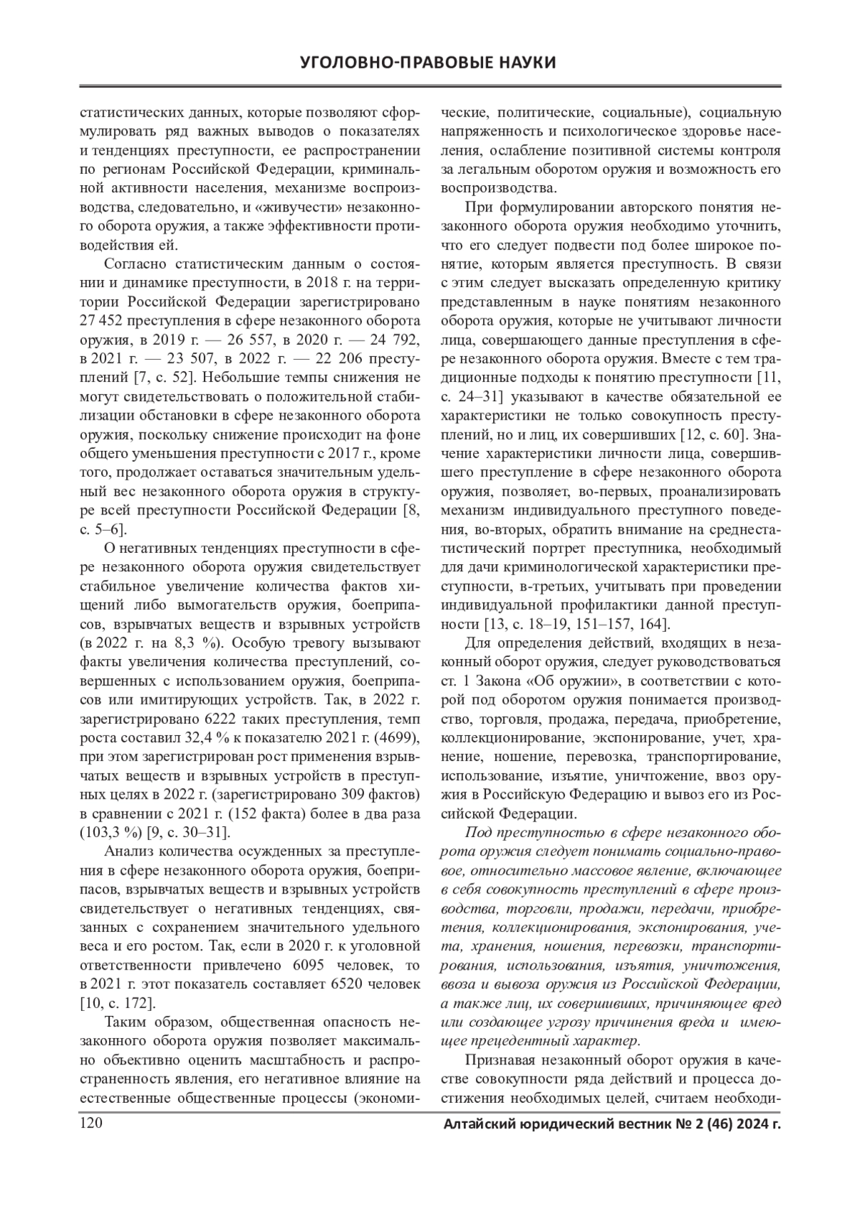 В статье анализируются существующие в науке понятия незаконного оборота оружия, рассматривается его общественная опасность через вредоносность и прецедентность, социальные, экономические политические и психологические аспекты, предлагается авторская редакция незаконного оборота оружия как совокупности совершенных преступлений и лиц, их совершивших.
