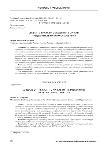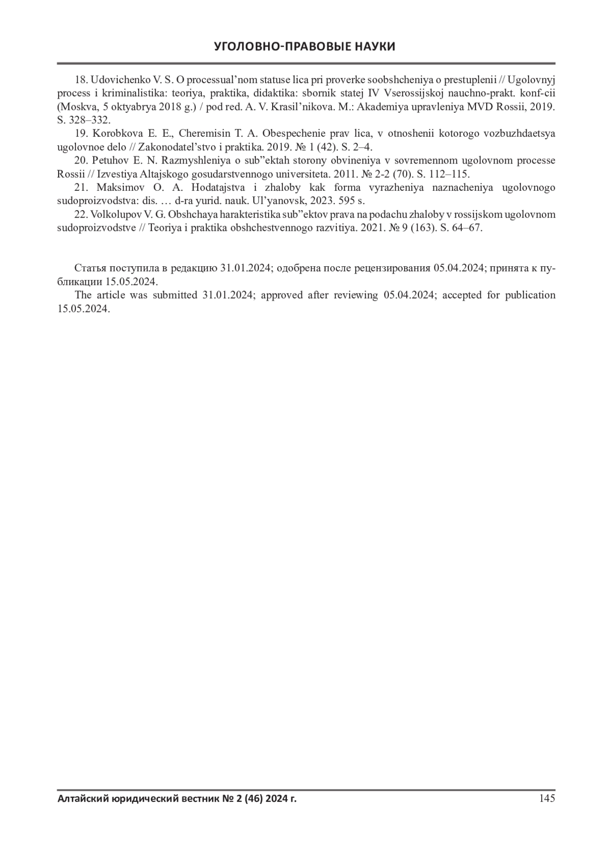 22. Волколупов В. Г. Общая характеристика субъектов права на подачу жалобы в российском уголовном судопроизводстве //Теория и практика общественного развития. 2021. № 9 (163). С. 64-67. EDN: FGGQDI