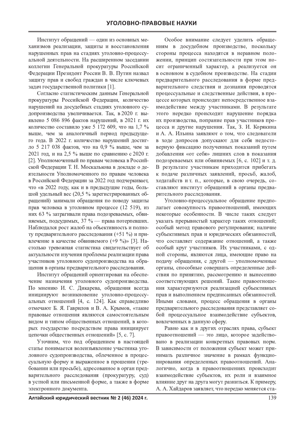 4. Дикарев И. С. Процессуальные обращения в досудебном производстве по уголовным делам // Уголовное право. 2020. № 6 (124). С. 124-128. EDN: YMVVGN