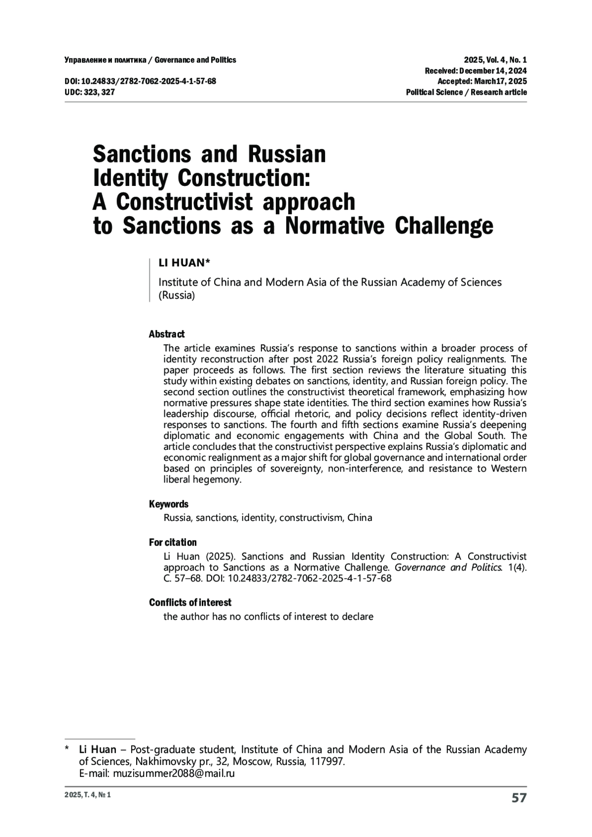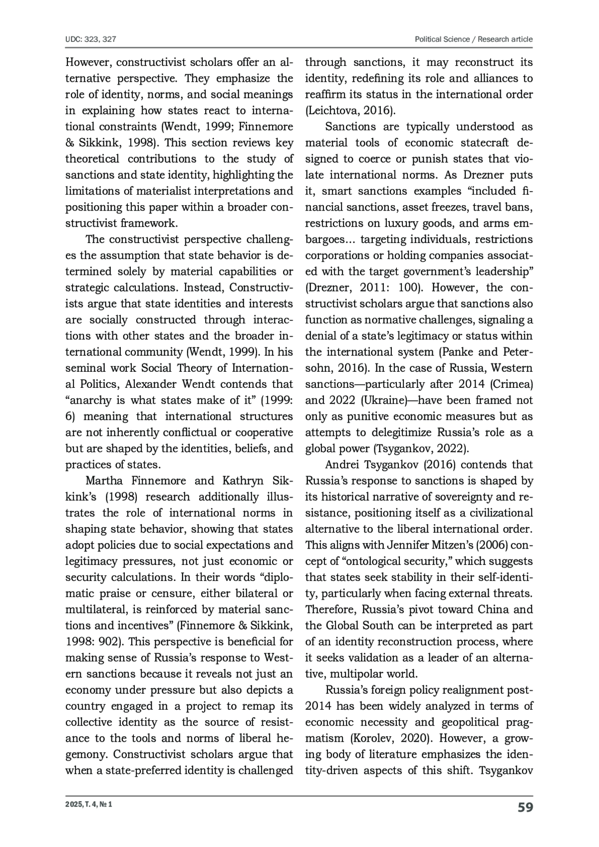 The article examines Russia’s response to sanctions within a broader process of identity reconstruction after post 2022 Russia’s foreign policy realignments. The paper proceeds as follows. The first section reviews the literature situating this study within existing debates on sanctions, identity, and Russian foreign policy. The second section outlines the constructivist theoretical framework, emphasizing how normative pressures shape state identities. The third section examines how Russia’s leadership discourse, official rhetoric, and policy decisions reflect identity-driven responses to sanctions. The fourth and fifth sections examine Russia’s deepening diplomatic and economic engagements with China and the Global South. The article concludes that the constructivist perspective explains Russia’s diplomatic and economic realignment as a major shift for global governance and international order based on principles of sovereignty, non-interference, and resistance to Western liberal hegemony.