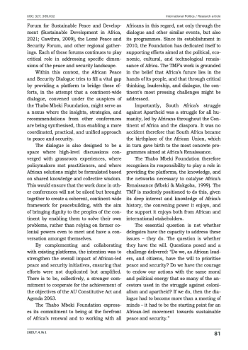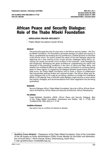 The article discusses the role of a new actor in the African security system – the Thabo Mbeki Foundation. The Foundation promotes dialogue on peace and security in Africa, complements the existing security architecture, created primarily on the basis of the African Union. The author reveals the values of the new Dialogue whose key objectives are a clear framing of the current security challenges facing Africa; uprooting the causes and drivers of the conflicts in the continent – both endogenous and exogenous; developing the peace architecture; understanding the nature and character of the prevailing conditions in the Horn of Africa and West Africa, and whether the multilateral efforts can make a modest contribution to achieving lasting peace in these regions. In organizing the dialogue between governments and nonstate acrors, the Thabo Mbeki Foundation tries to foster a culture of collaboration that transcended political divides and national borders. The African Peace and Security Dialogue tries to fill a gap by providing a platform to bridge the multilateral efforts in the attempt that a continent-wide dialogue might serve as a nexus where the insights, strategies, and recommendations from other negotiation fora are being synthesised.