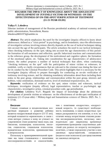 В статье актуализируется необходимость использования тактических приемов, при проверке показаний на месте, с учетом возрастных особенностей данного периода: формирование самосознания и рефлексии, специфических поведенческих реакций и общение в референтной группе, развитие мотивационной и когнитивной сферы, сформированность эмоциональной сферы и т. д. С учетом возрастных особенностей несовершеннолетних подросткового возраста, автором предлагается целый ряд тактических приемов, позволяющих при производстве «проверки показаний на месте» с участием несовершеннолетних потерпевших или свидетелей установить, проверить или уточнить обстоятельства, имеющие значение для уголовного дела за время, установленное для его проведения уголовно-процессуальным кодексом.