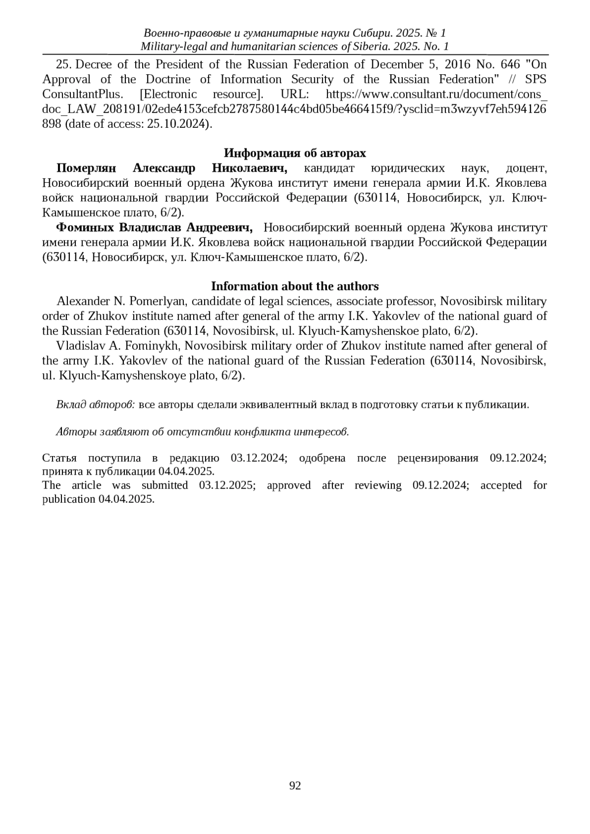 25. Указ Президента РФ от 05 декабря 2016 г. № 646 “Об утверждении Доктрины информационной безопасности Российской Федерации” // СПС КонсультантПлюс. [Электронный ресурс]. URL: https://www.consultant.ru/document/cons_doc_LAW_208191/02ede4153cefcb2787580144c4bd05be466415f9/?ysclid=m3wzyvf7eh594126898 (дата обращения: 25.10.2024).