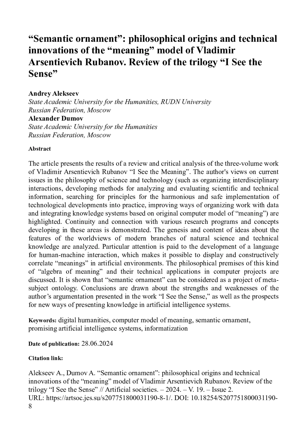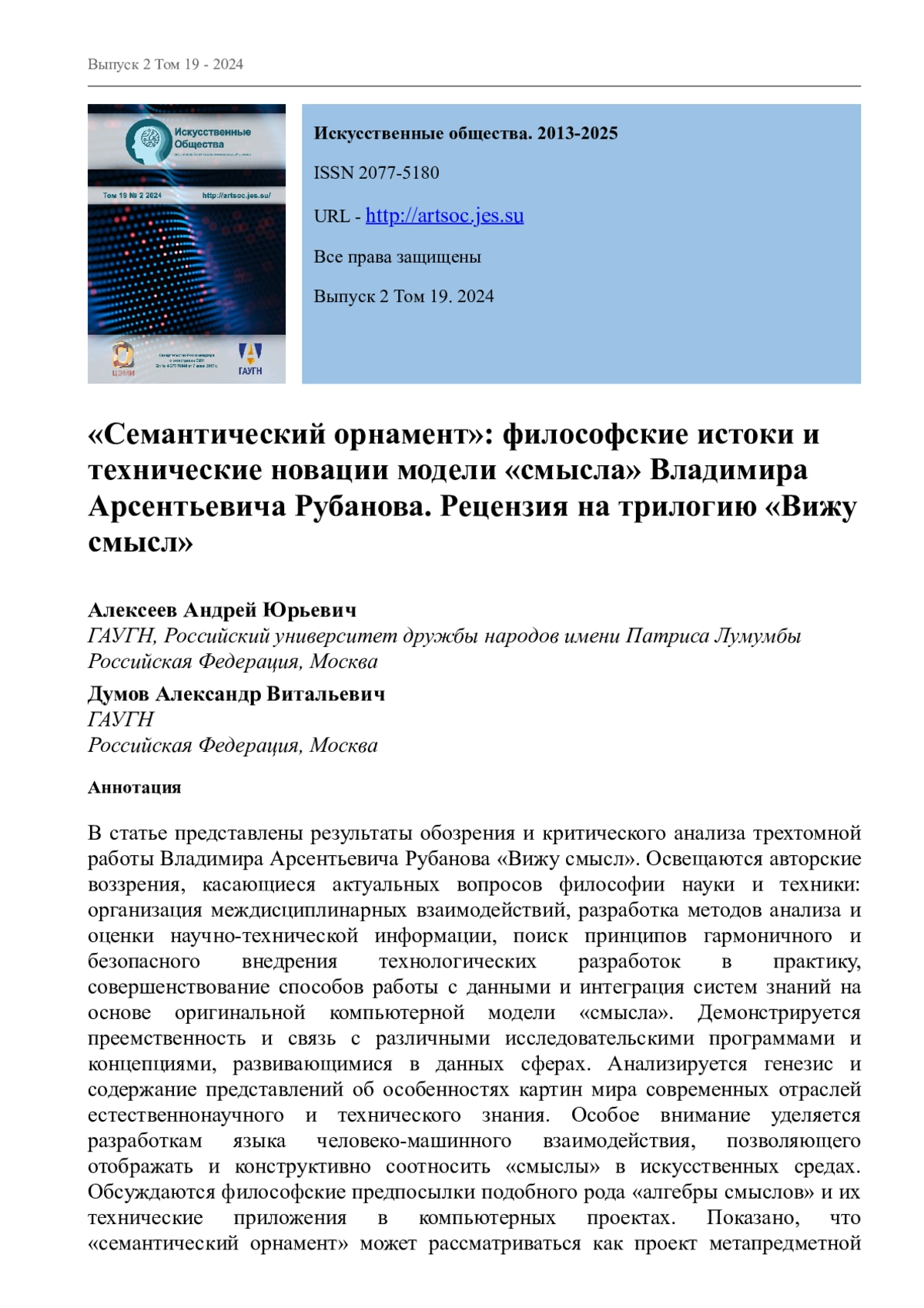 В статье представлены результаты обозрения и критического анализа трехтомной работы Владимира Арсентьевича Рубанова «Вижу смысл». Освещаются авторские воззрения, касающиеся актуальных вопросов философии науки и техники: организация междисциплинарных взаимодействий, разработка методов анализа и оценки научно-технической информации, поиск принципов гармоничного и безопасного внедрения технологических разработок в практику, совершенствование способов работы с данными и интеграция систем знаний на основе оригинальной компьютерной модели «смысла». Демонстрируется преемственность и связь с различными исследовательскими программами и концепциями, развивающимися в данных сферах. Анализируется генезис и содержание представлений об особенностях картин мира современных отраслей естественнонаучного и технического знания. Особое внимание уделяется разработкам языка человеко-машинного взаимодействия, позволяющего отображать и конструктивно соотносить «смыслы» в искусственных средах. Обсуждаются философские предпосылки подобного рода «алгебры смыслов» и их технические приложения в компьютерных проектах. Показано, что «семантический орнамент» может рассматриваться как проект метапредметной онтологии. Делаются выводы о сильных и слабых сторонах авторской аргументации, представленной в работе «Вижу смысл», а также о перспективах новых способов представления знаний в системах искусственного интеллекта.