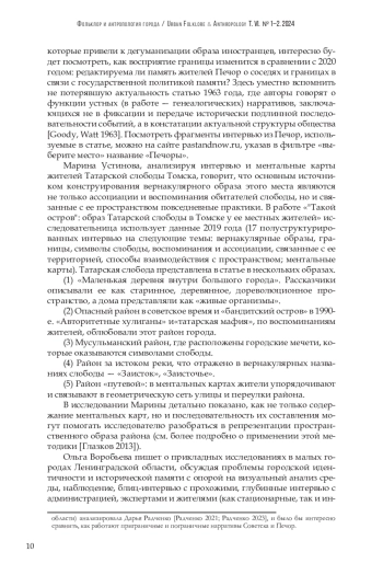 Марина Устинова, анализируя интервью и ментальные карты жителей Татарской слободы Томска, говорит, что основным источником конструирования вернакулярного образа этого места являются не только ассоциации и воспоминания обитателей слободы, но и связанные с ее пространством повседневные практики. В работе «“Такой остров”: образ Татарской слободы в Томске у ее местных жителей» исследовательница использует данные 2019 года (17 полуструктурированных интервью на следующие темы: вернакулярные образы, границы, символы слободы, воспоминания и ассоциации, связанные с ее территорией, способы взаимодействия с пространством; ментальные карты).
