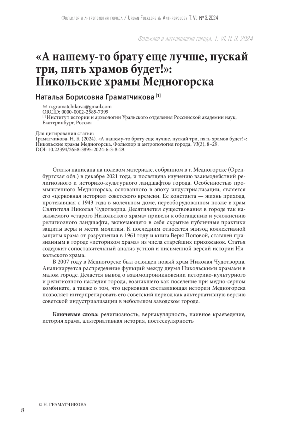 18. Никандрова, А. В. (2022). История Никольского храма в Медногорске: устный рассказ и книга. В Н. С. Петрова, Н. В. Петров (Сост.). Материалы XXII Международной школы по фольклористике и культурной антропологии, 58-59.