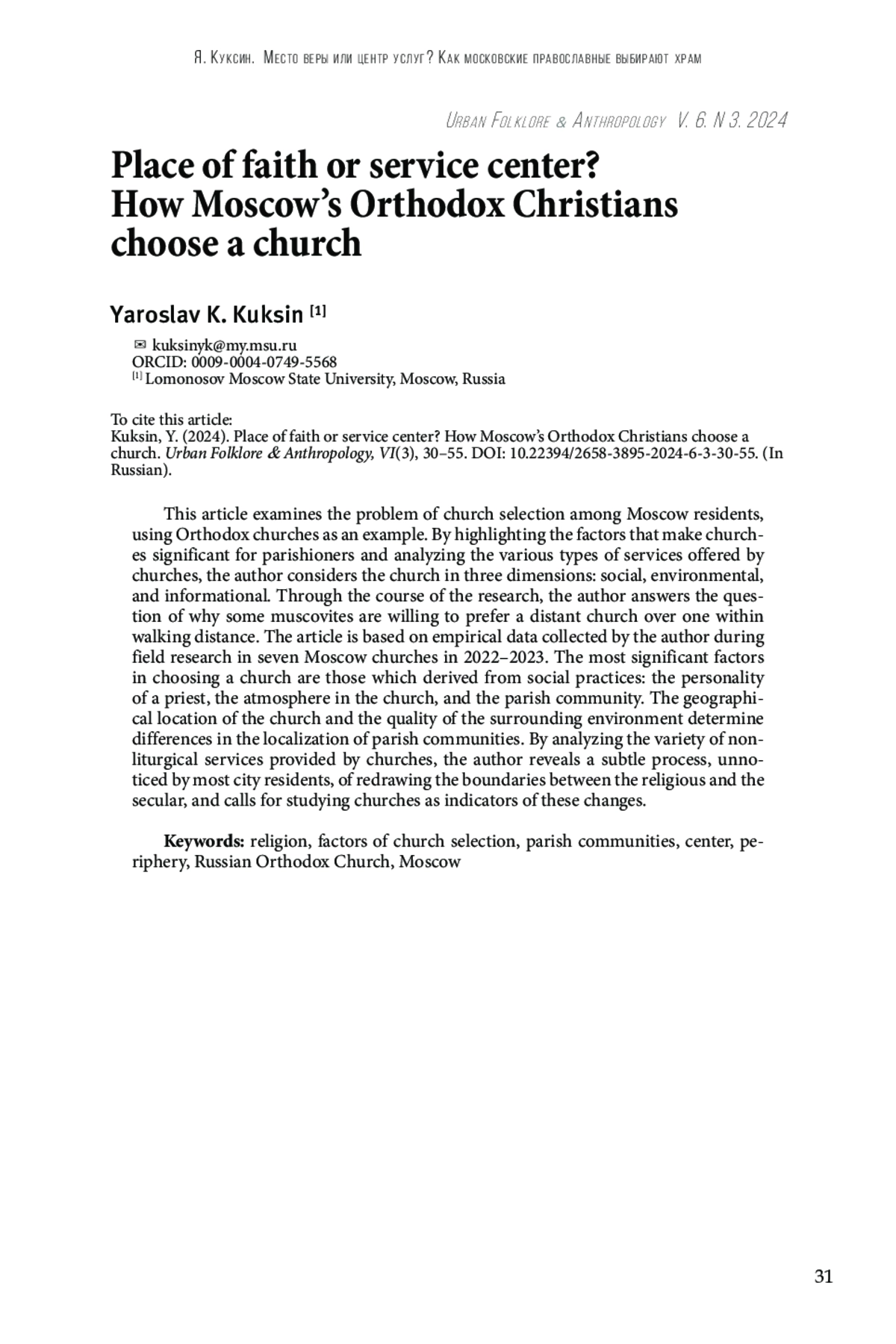 В статье на примере православных храмов проблематизируется выбор храма москвичами. Выделяя факторы значимости церквей для прихожан и дифференцируя различные виды услуг при храме, автор рассматривает храм в трех измерениях: социальном, средовом и информационном. В процессе исследования автор отвечает на вопрос о причинах готовности части москвичей предпочитать удаленный от дома приход храму в шаговой доступности. Статья основывается на эмпирических данных, собранных автором в ходе полевых исследований в семи московских приходах в 2022–2023 годах. Наиболее значимыми факторами выбора храма оказываются производные от социальных практик личность священнослужителя, атмосфера в приходе и приходская община. Географическое положение храма и качество окружающей среды определяют различия в локализации приходских общин. Анализируя разнообразие внебогослужебных услуг при храмах, автор показывает малозаметный большинству горожан процесс перекройки границ религиозного и профанного и призывает изучать храмы как индикаторы этих изменений.