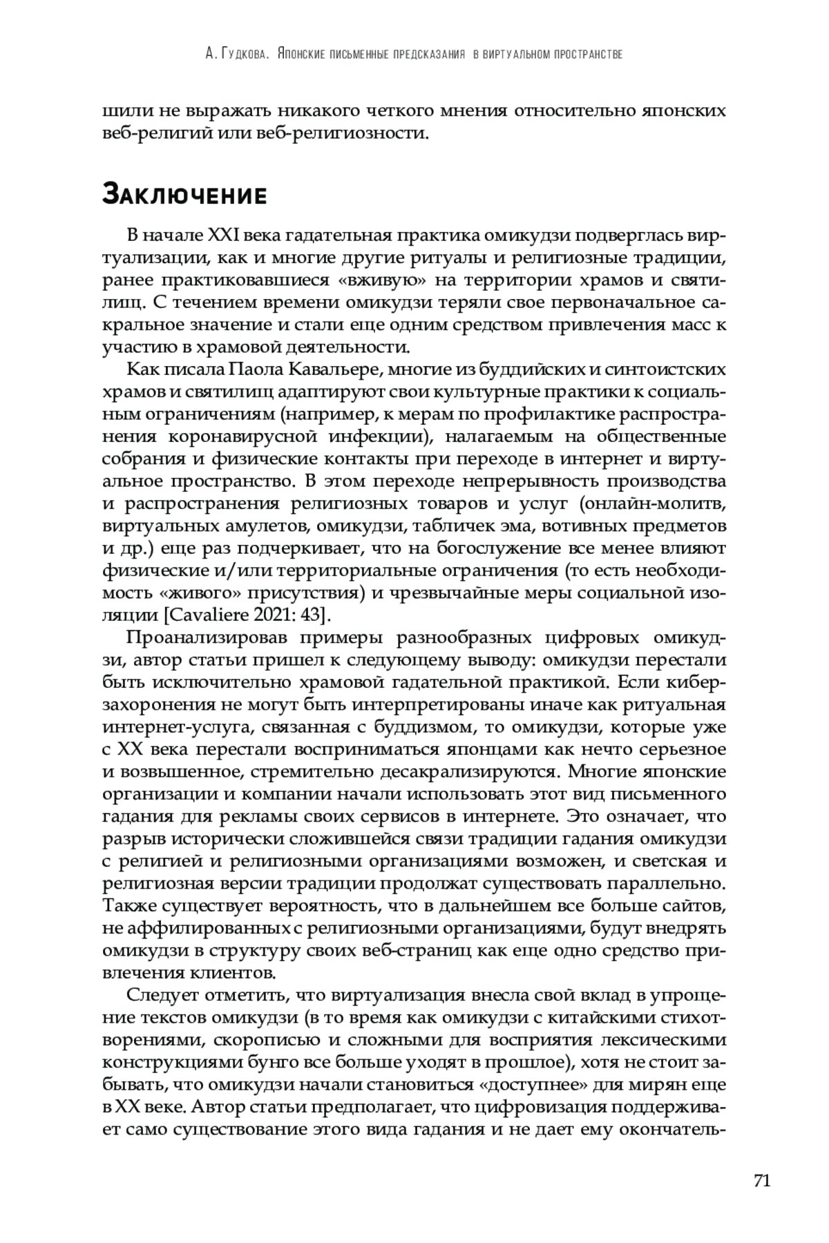 Предлагаемая вашему вниманию статья раскрывает проблему виртуализации известной традиционной японской гадательной практики — «омикудзи» (в переводе с японского языка «божественный жребий»), а также в некоторой степени затрагивает и более глобальный вопрос: как в настоящий момент развиваются японские религиозные практики в сети Интернет. Значительная часть исследования посвящена анализу процесса трансформации религиозной традиции, которая раньше практиковалась исключительно «вживую», и тому, как относятся современные японцы разных возрастных групп и социального положения к явлению веб-религиозности. Исследование выполнено автором на основе данных, полученных в результате интернет-опроса, проведенного в июле 2023 года. Всего на вопросы опросного листа ответили 32 человека (практически все информанты — японцы или проживающие в Японии долгое время иностранцы-экспаты). К статье прилагаются скриншоты цифровых омикудзи и их переводы, сделанные автором статьи. Результаты исследования показали, что виртуализация сделала практику омикудзи более доступной для мирян (в особенности для людей с ограниченными возможностями). Тексты предсказаний при их виртуализации были значительно упрощены. Однако, как следует из результатов опроса, доступность практики привела в определенной степени к потере доверия верующих. Если омикудзи и раньше воспринимались японцами как своего рода развлечение на территории храма или святилища, то переход практики в онлайн-пространство еще сильнее «упростил» эту практику. Кроме того, виртуализация сделала традиционное гадание еще одним средством для продвижения и рекламы японских коммерческих компаний, что негативно влияет на восприятие традиции омикудзи среди верующих.