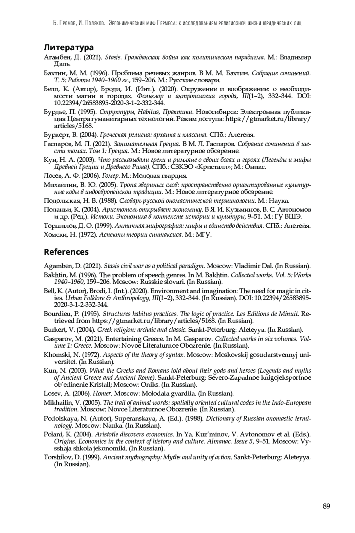 Статья посвящена новейшим формам проявления религиозности в пространстве города. Исследование сфокусировано на изучении религиозного аспекта городской эргонимии. Исследовав вывески магазинов, навигационные карты, товары на полках сетевых магазинов, использующие имена богов Древней Греции, авторы поставили задачу реконструкции невербализованного мифологического нарратива, составленного эргонимами и товарными именованиями. Религиозная жизнь городского пространства понимается в статье в качестве характерных для древнегреческой религиозности практик благочестия: воззвания и посвящения. Реконструируются специфические механизмы воспроизводства культуры в Древней Греции и Европе XXI века. На основании проведенного различия описывается «мифосоциализирующая» функция современного образования в процессе трансляции мифологического нарратива и реинтерпретации олимпийского мифа. Статья обращается к данным о религиозной жизни юридических лиц. На основе анализа частотности упоминания имен олимпийских богов в едином реестре юридических лиц и сопоставления имен богов с заявленными формами экономической деятельности реконструируется олимпийский миф XXI века — «Эргонимический миф Гермеса». Статья предполагает описание материально воплощенных пространств священного на улицах современных городов методом хорографии. Подобный подход представляется новым в исследовании культуры и человеческого общежития.