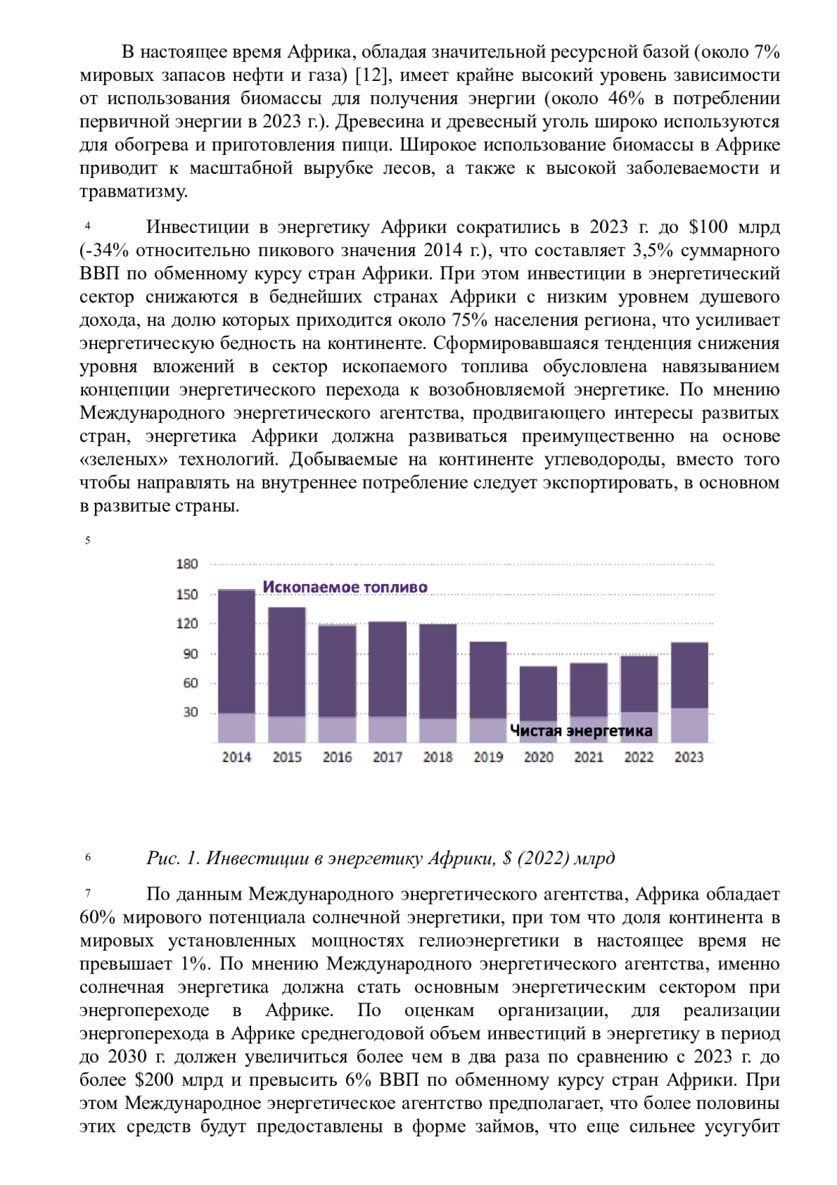 Согласно оценкам ООН, население Африки в 2023 г. превысило 1,4 млрд человек и составило более 18% численности населения мира [14]. В то же время уровень бедности в Африке, в том числе в энергетической сфере, остаётся самым высоким среди регионов мира. По данным Международного энергетического агентства, в 2023 г. около 600 млн человек или 48% населения стран Африки к югу от Сахары не имели доступа к электроэнергии; около 1 млрд человек или более 68% населения Африки не имели доступ к экологически чистым технологиям приготовления пищи [8]. По сравнению со среднемировым уровнем в 2023 г. потребление в Африке первичной энергии на душу населения было меньше в три раза, нефти и газа – в пять раз [10].
