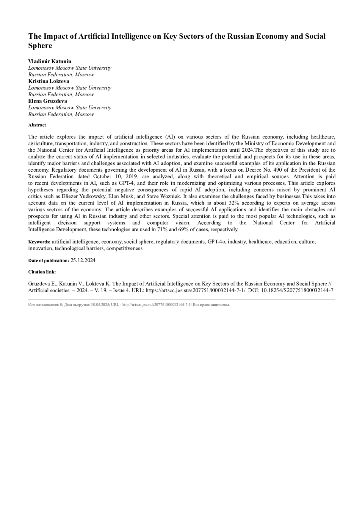 В статье рассмотрено влияние искусственного интеллекта на ключевые отрасли российской экономики и социальной сферы, включая здравоохранение, сельское хозяйство, транспорт, промышленность и строительство. Данные сферы определены как приоритетные отрасли для внедрения ИИ до 2024 года Министерством экономического развития РФ и Национальным центром развития искусственного интеллекта при Правительстве РФ. Целями исследования являются анализ текущего состояния внедрения ИИ в выбранных отраслях, оценка потенциала и перспектив использования ИИ в этих сферах, выявление основных барьеров и вызовов, связанных с внедрением ИИ, а также изучение успешных примеров применения ИИ в российской экономике. Проведен анализ нормативных документов, регулирующих развитие ИИ в России, с акцентом на Указ Президента Российской Федерации от 10 октября 2019 г. № 490, а также теоретических и эмпирических источников. Особое внимание уделено современным версиям ИИ, таким как GPT-4o, и их роли в модернизации и оптимизации различных процессов. В статье исследуются гипотезы о возможных негативных последствиях стремительного внедрения ИИ, включая опасения, высказываемые такими известными критиками ИИ, как Элиезер Юдковский, Илон Маск и Стив Возняк, и рассматриваются вызовы, с которыми сталкиваются предприятия. При этом учитываются данные о текущем уровне внедрения ИИ в России, который, по оценкам экспертов, составляет около 32% в среднем по отраслям экономики. Описаны примеры успешного применения ИИ, а также выявлены основные препятствия и перспективы его использования в российской промышленности и других секторах. Особое внимание уделяется наиболее востребованным технологиям ИИ, таким как интеллектуальные системы поддержки принятия решений и компьютерное зрение, которые, согласно данным Национального центра развития искусственного интеллекта, используются в 71% и 69% случаев соответственно.