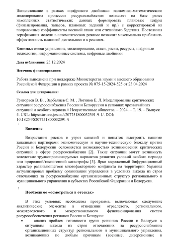 В статье рассматриваются проблемы поддержания процессов ресурсоснабжения как основы жизнеобеспечения регионов России и Белоруссии в критических условиях. Выход из строя центров управления (в т. ч. информационных систем и систем связи) экономикой региона и крупного муниципального образования (областного центра) ставит задачу формирования организационно-информационного механизма замещения выбывших управленческих функционалов. Предлагается формирование параллельного или защищенного контура управления, который на основе алгоритмов информационно-аналитической и вычислительной поддержки обеспечит замещение выбывших управленческих функционалов с готовностью работы в условиях с существенной компонентой неопределенности, недостатка или некорректности данных о ситуационной обстановке. Сформулирован адаптированный к рассматриваемым ситуациям - в условиях с существенной компонентой неопределенности развития военно-политической ситуации - аппарат стохастического моделирования. Использование в рамках «цифрового двойника» экономико-математического моделирования процессов ресурсоснабжения позволяет на базе ранее накопленных статистических данных формировать плановые цифры (финансирования, запасов, плановых заданий и пр.) с корректировкой на поправочные коэффициенты военной атаки или стихийного бедствия. Постоянная верификация модели в автоматическом режиме позволит максимально приблизить эффективность плановой деятельности к реалиям.