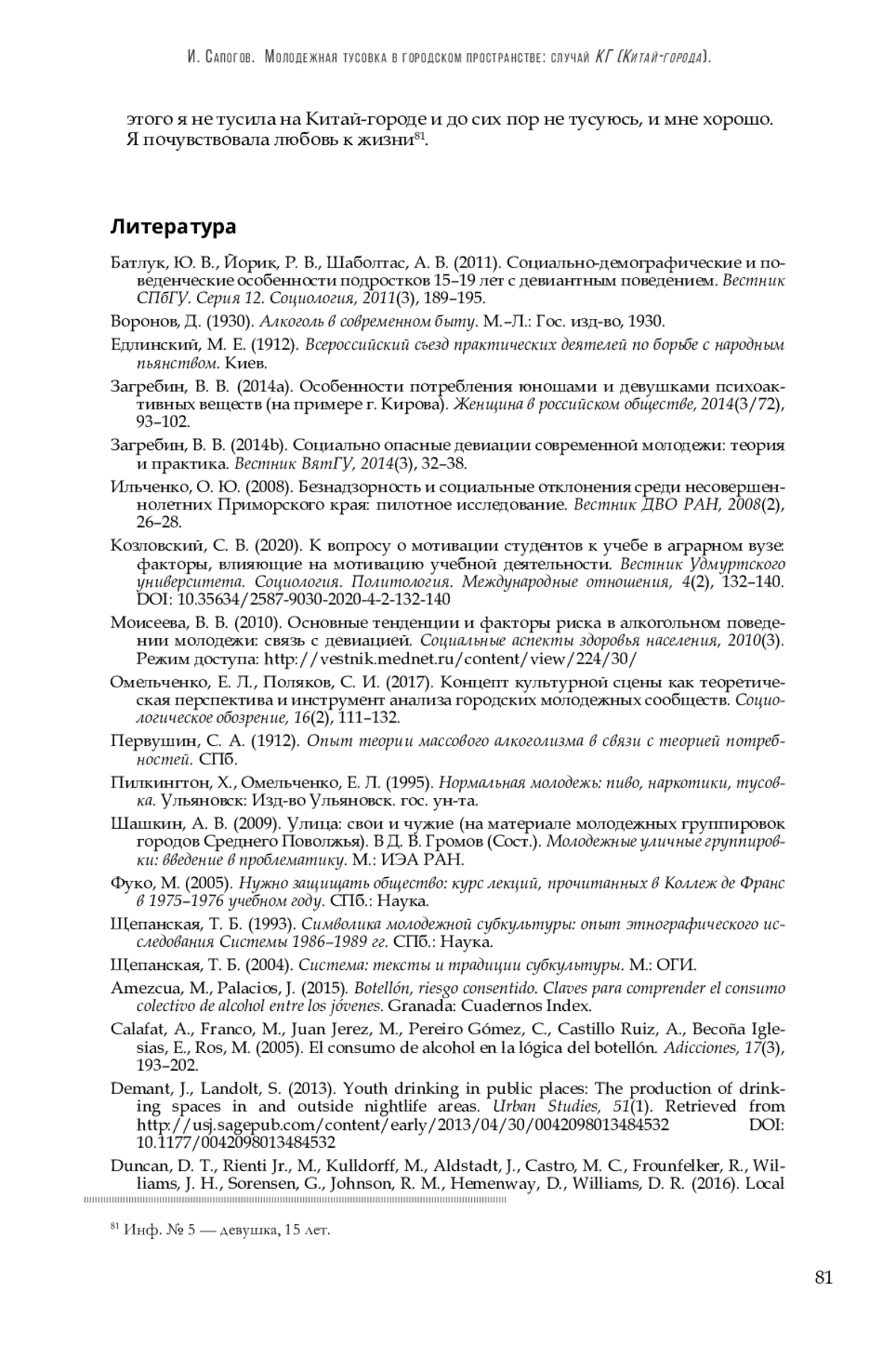 4. Загребин, В. В. (2014a). Особенности потребления юношами и девушками психоактивных веществ (на примере г. Кирова). Женщина в российском обществе, 2014(3/72), 93-102.