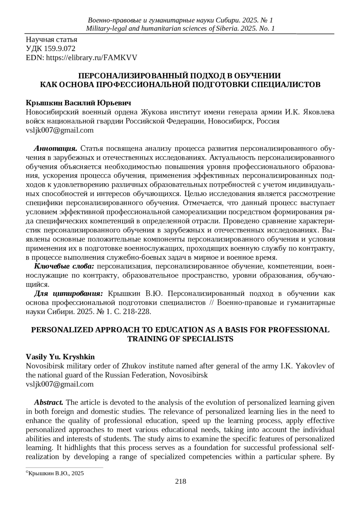 Выявлены основные положительные компоненты персонализированного обучения и условия применения их в подготовке военнослужащих, проходящих военную службу по контракту, в процессе выполнения служебно-боевых задач в мирное и военное время.
