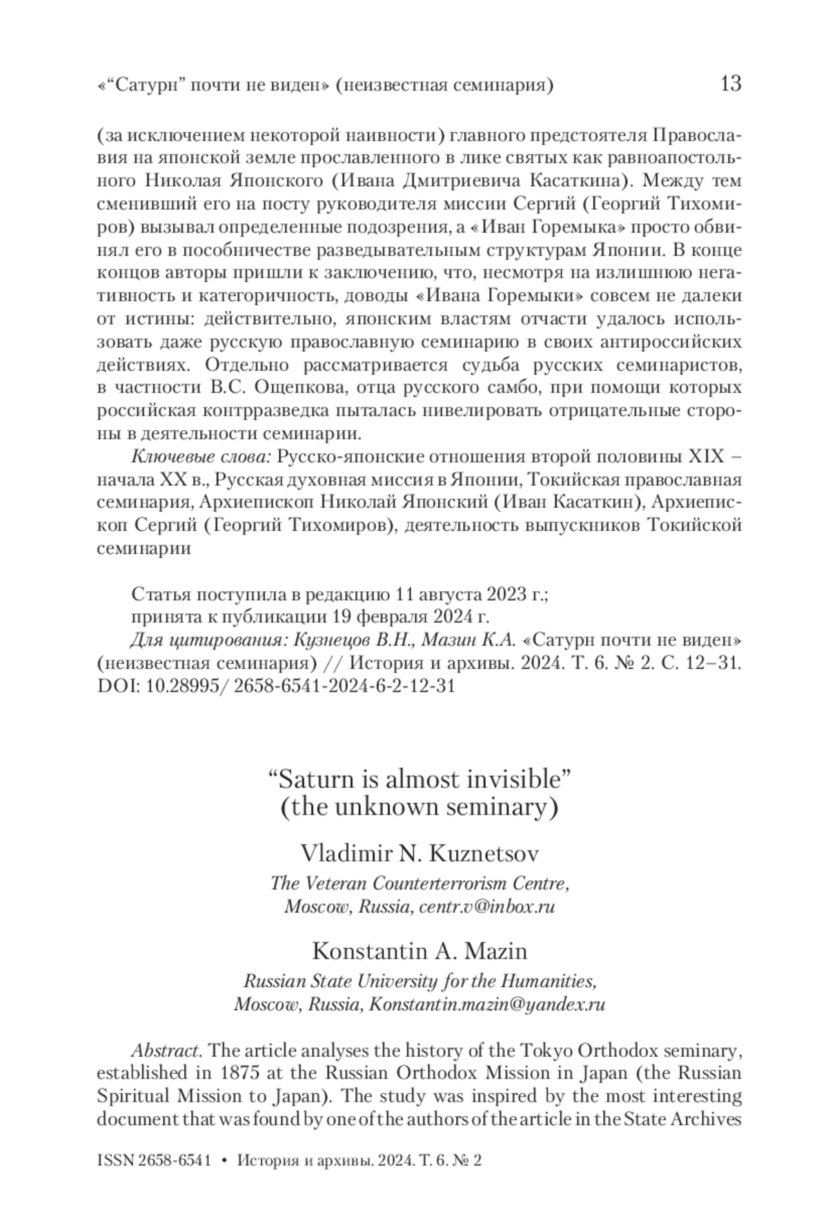 В статье анализируется история Токийской духовной семинарии, возникшей в 1875 г. при Русской Духовной миссии в Японии. Обращение к данному сюжету обусловлено тем, что один из авторов статьи обнаружил в Государственном Архиве Российской Федерации в фонде известного церковного деятеля протоиерея П. И. Булгакова интереснейший документ под названием «Школа императорской русско-православной церкви (Тихоновской) для образования японских шпионов» (ГА РФ. Ф. Р-597. Оп. 1. Д. 135), подписанный литературным псевдонимом «Иван Горемыка». В нем с совершенно новых позиций рассматривается деятельность Токийской семинарии, которая в российской историографии всегда позиционировалась как одно из высших достижений проявления «мягкой силы» для увеличения влияния России на японских островах. Такой подход привел к необходимости подробного анализа всех сторон функционирования описываемого образовательного учреждения, которому и посвящена большая часть предлагаемой статьи. Особое внимание уделено деятельности семинаристов после окончания семинарии, а также степени ответственности за выдвинутые обвинения руководителей миссии. Причем ни сам «разоблачитель», ни один из представителей русской колонии в Токио не подвергали сомнению непричастность(за исключением некоторой наивности) главного предстоятеля Православия на японской земле прославленного в лике святых как равноапостольного Николая Японского (Ивана Дмитриевича Касаткина). Между тем сменивший его на посту руководителя миссии Сергий (Георгий Тихомиров) вызывал определенные подозрения, а «Иван Горемыка» просто обвинял его в пособничестве разведывательным структурам Японии. В конце концов авторы пришли к заключению, что, несмотря на излишнюю негативность и категоричность, доводы «Ивана Горемыки» совсем не далеки от истины: действительно, японским властям отчасти удалось использовать даже русскую православную семинарию в своих антироссийских действиях. Отдельно рассматривается судьба русских семинаристов, в частности В. С. Ощепкова, отца русского самбо, при помощи которых российская контрразведка пыталась нивелировать отрицательные стороны в деятельности семинарии.