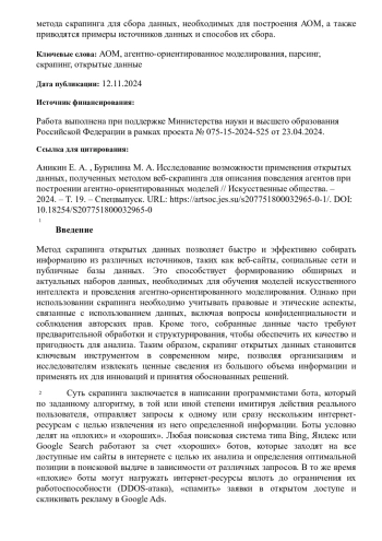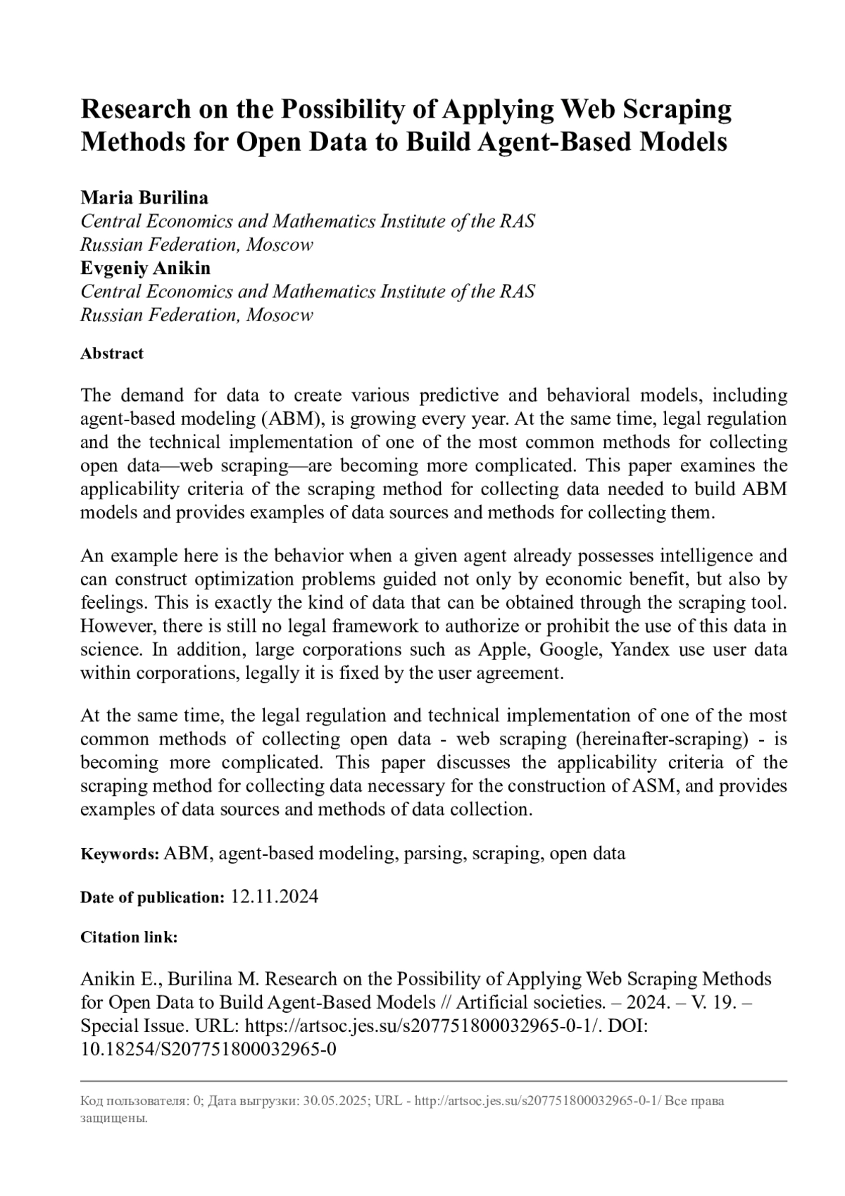 С каждым годом растет потребность в данных для создания различных предсказательных и поведенческих моделей, включая агентно-ориентированное моделирование (АОМ). Для построения когнетивных и сложных моделей, связанных с поведением агентов, необходимо применять как можно более точную базу знаний об этих агентах, зачастую среднестатистические данные из официальных источников остаются недостаточными при построении поведения агентов и их тонкой настройкой. Примером здесь может служить такое поведение, когда заданный агент уже обладает разумом и может строить оптимизационные задачи, руководствуясь не только экономической выгодой, но и чувствами. Именно такие данные можно получить благодаря инструменту- скрапингу. Однако, пока не существует законодательной базы, по которой можно разрешить или запретить использовать эти данные в науке. Помимо этого, большие корпорации, такие как Apple, Google, Яндекс используют пользовательские данные внутри корпораций, юридически это закреплено пользовательским соглашением. Одновременно усложняется законодательное регулирование и техническая реализация одного из наиболее распространенных методов сбора открытых данных — веб-скрапинга (далее-скрапинга). В данной работе рассматриваются критерии применимости 1 2 метода скрапинга для сбора данных, необходимых для построения АОМ, а также приводятся примеры источников данных и способов их сбора.