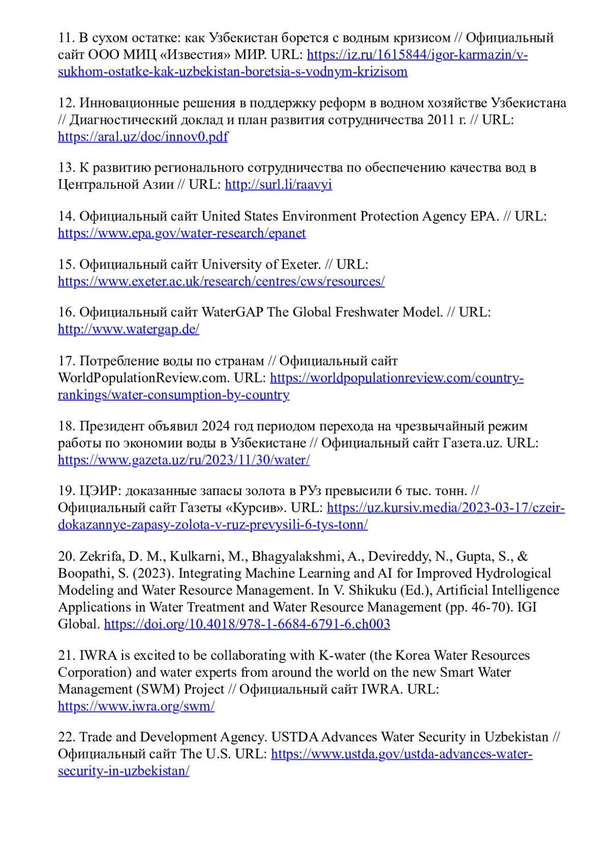 22. Trade and Development Agency. USTDA Advances Water Security in Uzbekistan // Официальный сайт The U.S. URL: https://www.ustda.gov/ustda-advances-water-security-in-uzbekistan.