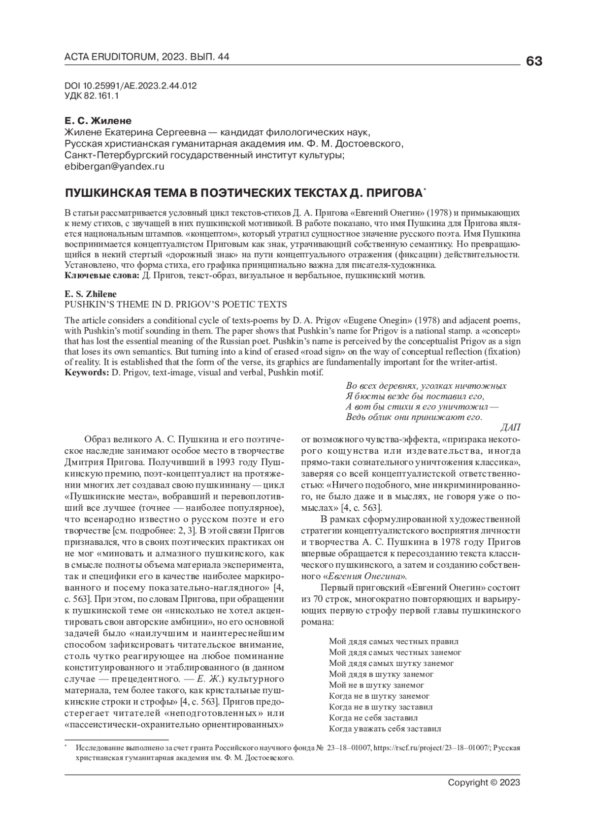 В статьи рассматривается условный цикл текстов-стихов Д. А. Пригова «Евгений Онегин» (1978) и примыкающих к нему стихов, с звучащей в них пушкинской мотивикой. В работе показано, что имя Пушкина для Пригова является национальным штампов. «концептом», который утратил сущностное значение русского поэта. Имя Пушкина воспринимается концептуалистом Приговым как знак, утрачивающий собственную семантику. Но превращающийся в некий стертый «дорожный знак» на пути концептуального отражения (фиксации) действительности. Установлено, что форма стиха, его графика принципиально важна для писателя-художника.