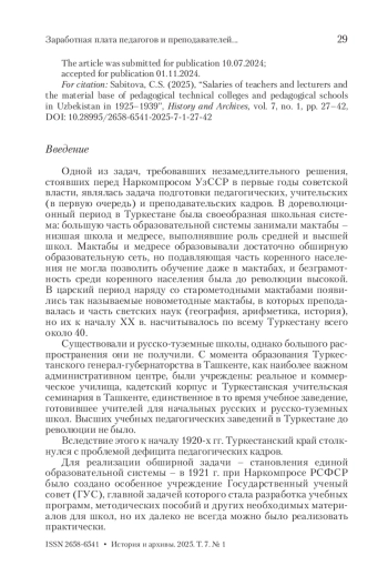 В статье автор проводит анализ изменений заработной платы учителей, преподавателей педагогических техникумов, финансового и хозяйственного состояния педагогических техникумов, общеобразовательных школ в Узбекистане в период с конца 1920-х по 1939 г. включительно. В статье приведены данные об изменениях в строительстве помещений, использовавшихся для учебы студентов педтехникумов. Описаны причины кадрового «голода» среди педсостава в школах, а также причины недостаточной укомплектации студентами педтехникумов как в целом в СССР, так и в Узбекской ССР. Проводится анализ тех решений, которые предпринимались Наркомпросом как страны в целом, так и Наркомпросом Узбекистана, учитывая те обстоятельства, что все решения, постановления и прочие нормативные акты были спускаемы из центра, все решения являлись идентичными. Дан краткий анализ влияния внутриполитической обстановки того времени на состояние системы народного образования и учительство в целом. Статья основана как на историографии, посвященной всеобучу, кадровому дефициту в среде педагогов в 1930-х гг., так и на неопубликованных материалах Национального архива Узбекистана (г. Ташкент), фонд 94, «Среднее специальное образование» 1925–1948 гг. Проанализировано, каким образом решения, принятые руководством Наркомпроса, изменили в лучшую сторону финансово-хозяйственную часть системы народного образования и благотворно отразились на всей системе образования в целом.