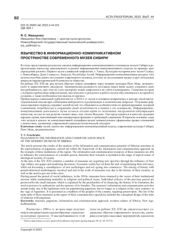 В статье представлены результаты анализа информационно-коммуникативного потенциала музеев Сибири в репрезентации язычества, выполненного в рамках информационно-коммуникативного подхода на примере трех учреждений региона: Первого музея славянской мифологии, г. Томск; Культурно-исторического музея Солнца, г. Новосибирск; Дома Солнца в с. Баштала, Республика Алтай. Информационно-коммуникативные ресурсы этих музеев способны влиять на сознание современного человека, поэтому их исследование входит в круг актуальных вопросов мировоззренческой безопасности общества. На рубеже XX-XXI вв. ряд музеев обретает новую специфику через влияние культуры Нью-Эйдж, неоязыческого и маркетингового дискурсов. Экономическая реальность поставила перед ними задачу сохранить свою востребованность, при этом не стать «рупором» новых мифологем и не «уйти в коммерцию». Смешение истории с псевдоисторическими мифологемами, мистического и реального в работе музеев обусловливалось историей их создания, а также необходимостью выхода из кризиса. Пройдя период социальной турбулентности, в 2010-х гг. музеи в основном возвратились к вектору своей институциональной миссии при соблюдении нейтралитета в религиозных и политических вопросах. Отдельные рефлексы прежнего периода сохраняет малый музей, что объясняется особенностями его финансирования, историей становления, потребностью в сохранении своей аутентичности и памяти о его основателях. Информационно-коммуникативная деятельность музея остается сегодня одним из легитимных инструментов популяризации язычества, но уже не как религии «нового века» или «эпохи Водолея». Оно представляется в качестве традиции народов страны, выполняющей консолидирующую функцию и требующей сохранения. В перечень основных задач этих музеев в аспекте их коммуникативной специфики входит концептуальное оформление правил отношений с язычеством, адекватных современной социально-политической ситуации.