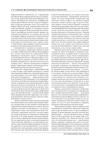 Статья посвящена исследованию взаимодействия христианства и язычества в современном кинематографе на примере российского телесериала «Территория». Их синтез и противопоставление показаны на примере следующих кластеров: символического (в него входят такие символические объекты, как крест, церковь, колодец, дерево, обереги); числового (к нему относится интерпретация в разных религиозных системах мистической цифры сорок); словесного (его образуют молитва и заклинание); событийного (заключается в противопоставлении церковного и языческого обрядов); созидательного (образован фигурами бога и рода как демиургов).