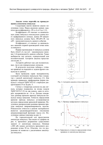 Для определения времени пролета частиц на заданном расстоянии в канале вывода пучка из ускорителя к экспериментальным установкам установлены две детекторные станции. Станции расположены на расстоянии 37 м друг от друга (времяпролетная база) и оснащены дистанционно перемещаемыми сцинтилляционными детекторами малых размеров 2×2 см. Система сбора данных регистрирует время прихода импульса и набор амплитуд (форма импульса) с шагом 8 нс [1]. Цель данной работы состояла в разработке метода более точного определения временной привязки импульса на основе данных о его форме. В результате анализа различных методов определения момента прихода сигнала разработан эффективный алгоритм для определения точки привязки импульса на основе интерполяции и двойного дифференцирования функциональной формы сигнала.