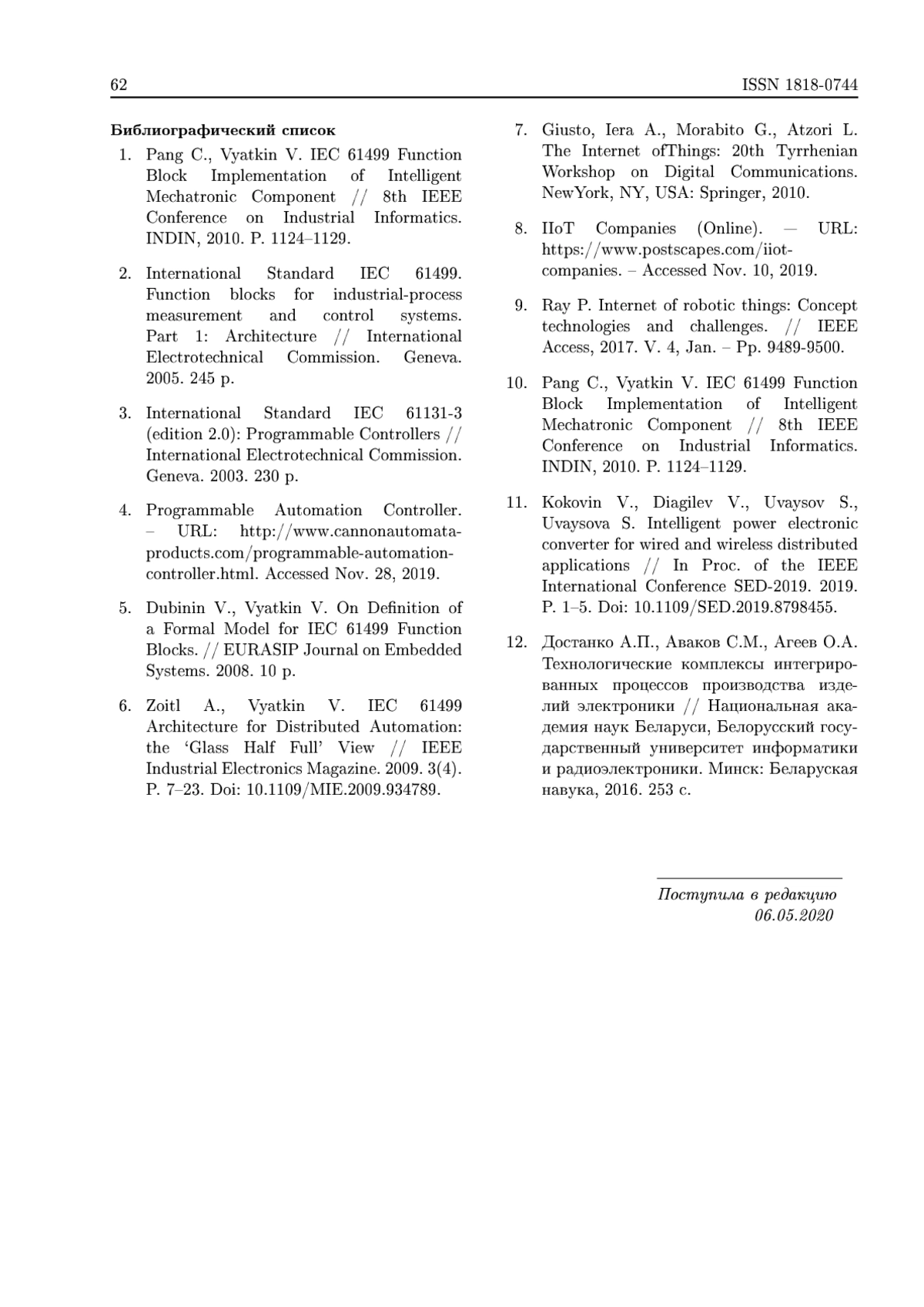 5. Dubinin V., Vyatkin V. On Definition ofa Formal Model for IEC 61499 FunctionBlocks. // EURASIP Journal on Embedded Systems. 2008. 10 p. EDN: MNOCQR