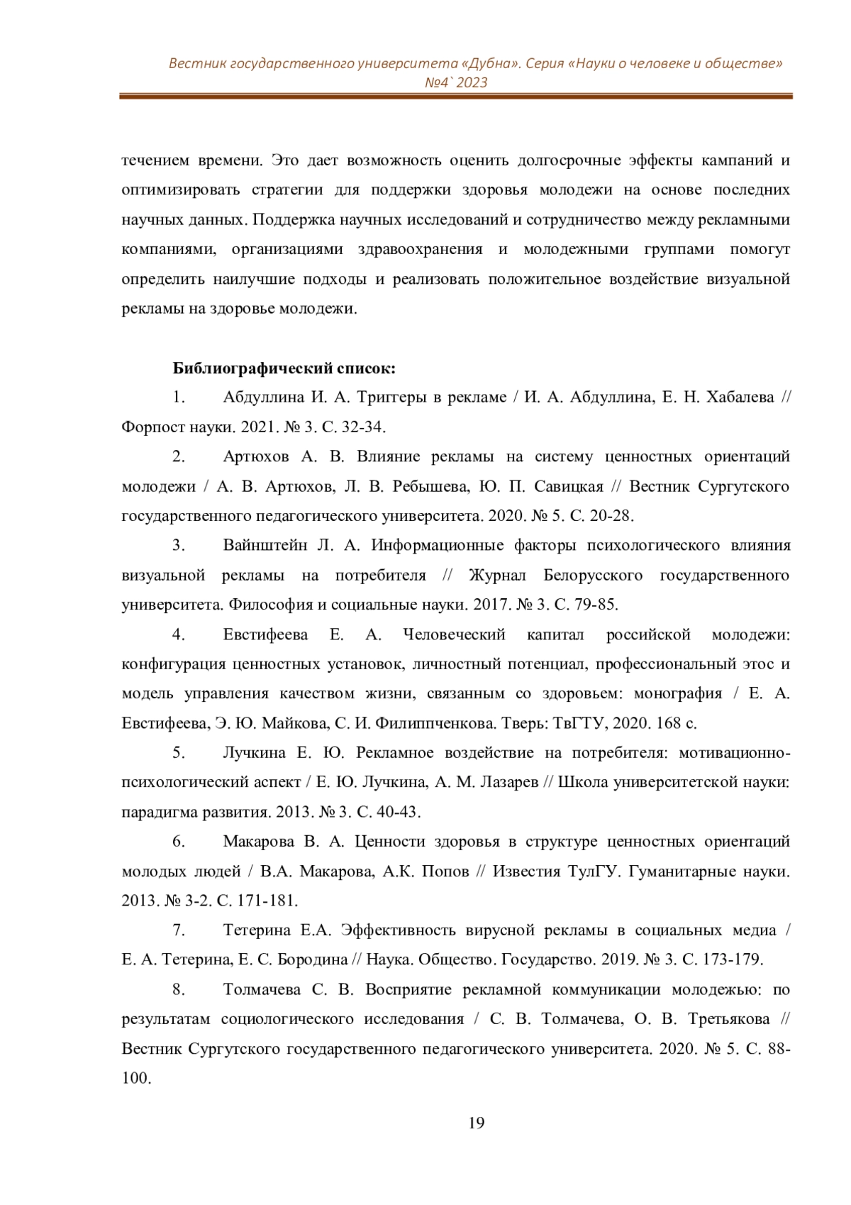 8. Толмачева С. В. Восприятие рекламной коммуникации молодежью: по результатам социологического исследования / С. В. Толмачева, О. В. Третьякова // Вестник Сургутского государственного педагогического университета. 2020. № 5. С. 88-100. EDN: XNUMSJ