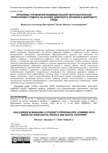 В статье исследуются проблемы управления индивидуальной образовательной траекторией (ИОТ) студентов, базирующейся на анализе цифрового профиля и цифрового следа. Авторы подчеркивают значимость персонализации образовательного процесса для повышения его эффективности и адаптации к уникальным потребностям учащихся. Рассматриваются основные вызовы, связанные с использованием цифрового следа, включая его ограниченность, неполноту данных и сложности при прогнозировании академической успешности. Особое внимание уделено вопросам интеграции цифрового профиля в системы управления обучением, где отсутствие единой стандартизированной структуры затрудняет анализ и перенос данных между различными образовательными учреждениями. Также обсуждаются угрозы конфиденциальности и этические аспекты, связанные с хранением и обработкой личных данных студентов. Авторы подчеркивают необходимость разработки универсальных стандартов для структуры цифрового профиля, а также внедрения более эффективных методов сбора и анализа данных, включая использование данных социальных сетей и видеоаналитики. В заключение статьи акцентируется внимание на необходимости нахождения баланса между глубоким уровнем персонализации и сохранением способности студентов адаптироваться к разнообразным образовательным контекстам, чтобы избежать риска гиперперсонализации.