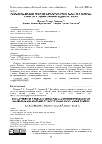 1. Кочешков А. Д., Смирнов Д. П., Дедович Т. Г. Разработка информационной системы контроля и оценки знаний студентов по математическим дисциплинам в университете “Дубна”// Системный анализ в науке и образовании. 2021. № 2. C. 140-150. URL: http://sanse.ru/download/442. EDN: XKJCCA