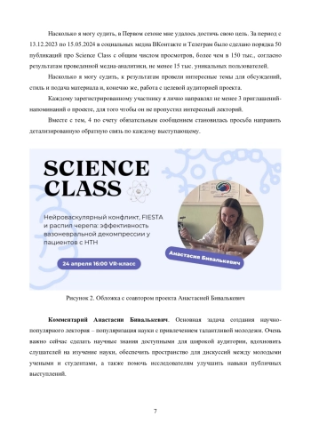 В статье описаны результаты первого сезона студенческого проекта «Научнопопулярный лекторий «Science Class» (2022 – 2023 учебный года).