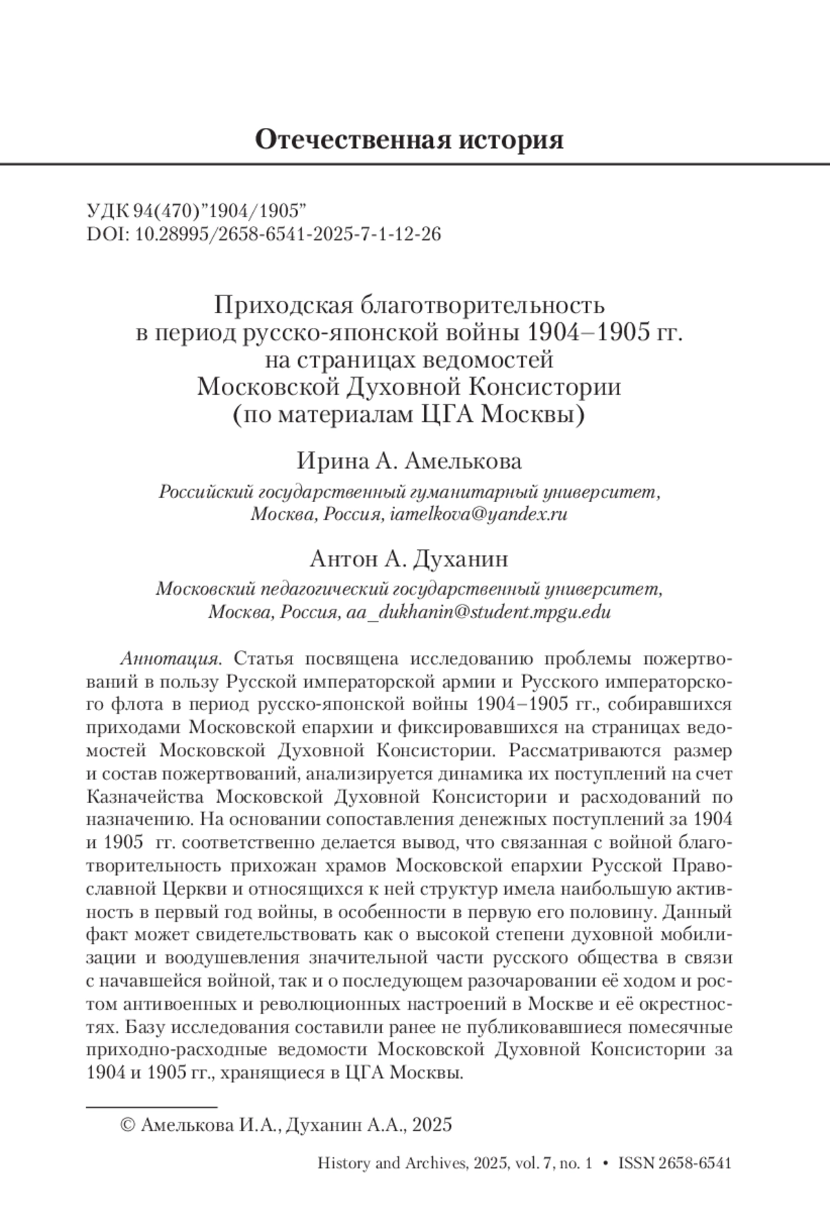 Статья посвящена исследованию проблемы пожертвований в пользу Русской императорской армии и Русского императорского флота в период русско-японской войны 1904–1905 гг., собиравшихся приходами Московской епархии и фиксировавшихся на страницах ведомостей Московской Духовной Консистории. Рассматриваются размер и состав пожертвований, анализируется динамика их поступлений на счет Казначейства Московской Духовной Консистории и расходований по назначению. На основании сопоставления денежных поступлений за 1904 и 1905 гг. соответственно делается вывод, что связанная с войной благотворительность прихожан храмов Московской епархии Русской Православной Церкви и относящихся к ней структур имела наибольшую активность в первый год войны, в особенности в первую его половину. Данный факт может свидетельствовать как о высокой степени духовной мобилизации и воодушевления значительной части русского общества в связи с начавшейся войной, так и о последующем разочаровании её ходом и ростом антивоенных и революционных настроений в Москве и её окрестностях. Базу исследования составили ранее не публиковавшиеся помесячные приходно-расходные ведомости Московской Духовной Консистории за 1904 и 1905 гг., хранящиеся в ЦГА Москвы.