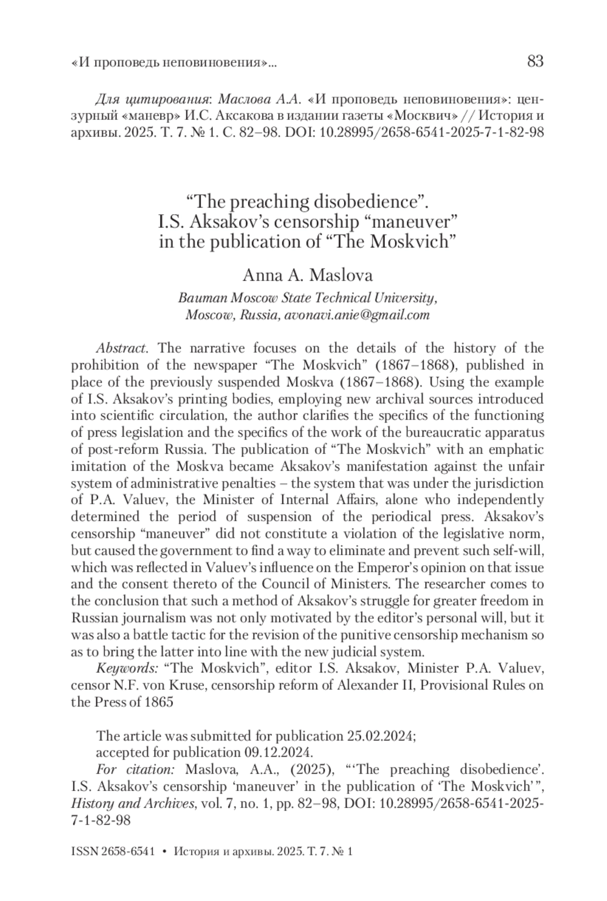 В центре повествования – подробности истории запрещения газеты «Москвич» (1867–1868), издаваемой взамен приостановленной ранее «Москвы» (1867–1868). На примере печатных органов И. С. Аксакова, используя новые вводимые в научный оборот архивные источники, автор проясняет специфику функционирования законодательства о печати и особенности работы бюрократического аппарата пореформенной России. Издание «Москвича» с подчеркнутым подражанием «Москве» стало манифестацией Аксакова против несправедливой системы административных взысканий, которая находилась в ведении одного только министра внутренних дел П. А. Валуева, самостоятельно определяющего срок приостановки органов периодической печати. Цензурный «маневр» Аксакова не представлял собой нарушение законодательной нормы, но вызвал необходимость правительства найти способ ликвидировать и предотвратить подобное своеволие, что выразилось во влиянии Валуева на мнение императора по данному вопросу и согласии с ним Совета министров. Исследователь приходит к выводу, что этот метод борьбы Аксакова за расширение свободы российской журналистики был обусловлен не только личной мотивацией редактора, но также являлся тактикой сражения за пересмотр механизма карательной цензуры и приведение его в соответствие с новой судебной системой.