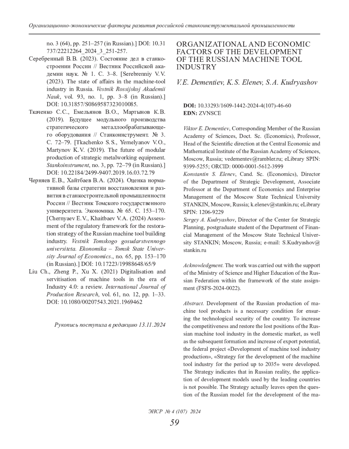 2. Афанасьев А. А. (2024). Станкостроение в России: курс на технологический суверенитет // Вопросы инновационной экономики. Т. 14. № 3. С. 769-788. DOI: 10.18334/vinec.14.3.121156 EDN: UNIAKQ