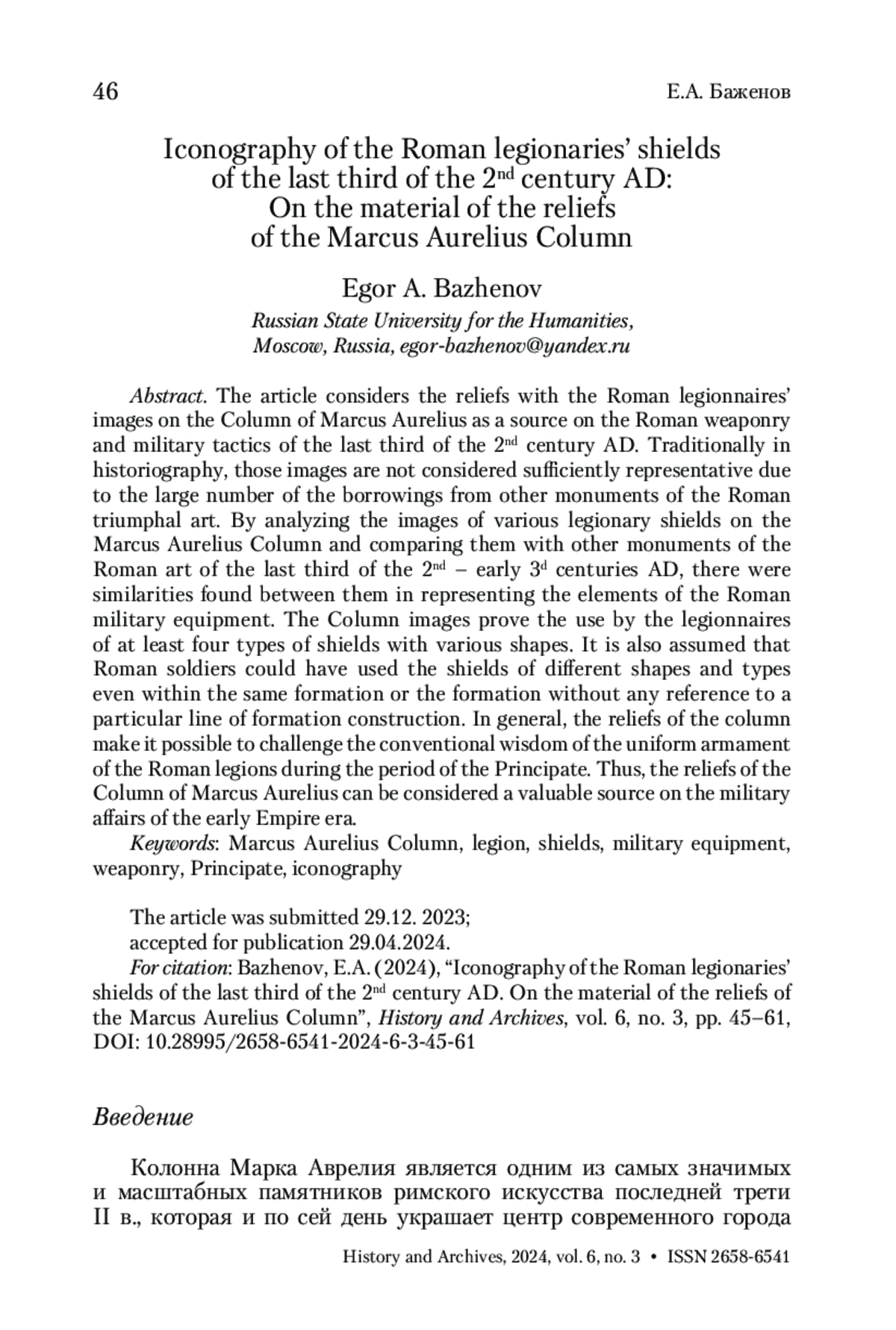 В статье рассматриваются рельефы с изображениями римских легионеров на колонне Марка Аврелия в качестве источника по римскому военному снаряжению и военной тактике последней трети II в. Традиционно в историографии данные изображения не считаются достаточно репрезентативными из-за большого числа заимствований из других памятников римского триумфального искусства. Посредством анализа изображений различных типов легионерских щитов на колонне Марка Аврелия и сопоставления их с другими памятниками римского искусства последней трети II – начала III в. между ними были выявлены совпадения в репрезентации элементов римского военного снаряжения. На колонне фиксируется использование легионерами как минимум четырех типов щитов различных форм. Также предполагается, что разные по формам и типам щиты могли использоваться римскими воинами даже в рамках одного строя или формации без привязки к конкретной линии построения. В целом рельефы колонны позволяют подвергнуть сомнению устоявшиеся представления о единообразном вооружении римских легионов в период принципата. Таким образом, рельефы колонны Марка Аврелия можно рассматривать как ценный источник по военному делу эпохи ранней Империи.