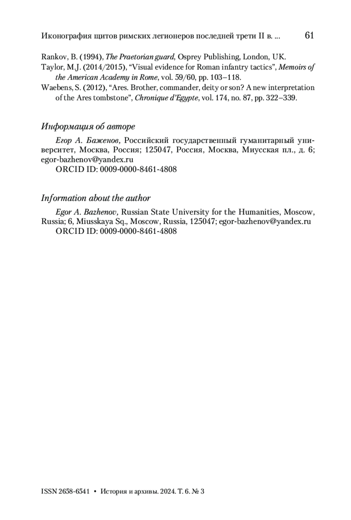 4. Дороненко 2020 - Дороненко И.А. Преторианская гвардия на полях сражений II в. н. э. // Актуальные проблемы исторических исследований: взгляд молодых ученых: сборник материалов Международной молодежной школы-конференции (12-14 октября 2020 г.). Новосибирск: НГУ, 2020. С. 130-138.