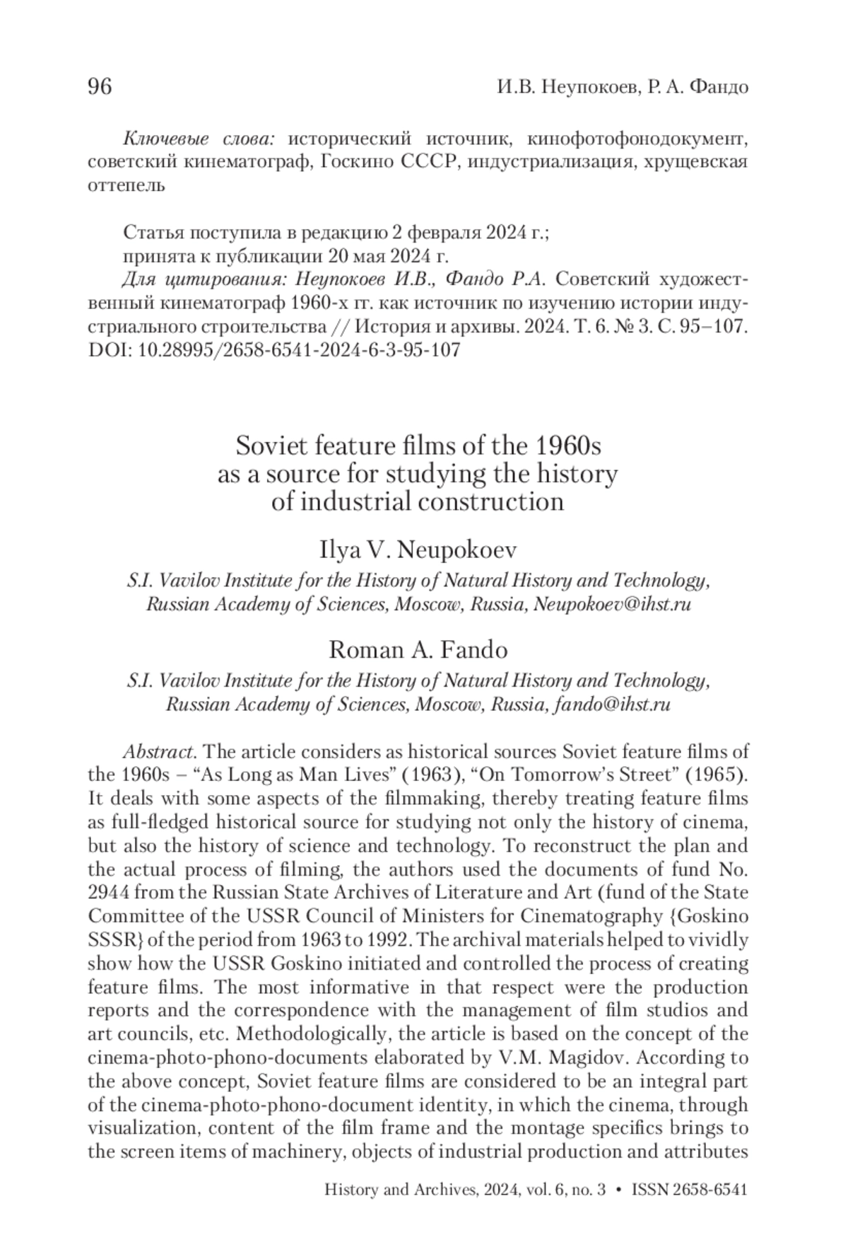 В статье рассмотрены в качестве исторических источников советские художественные фильмы 1960-х гг. – «Пока жив человек» (1963 г.), «На завтрашней улице» (1965 г.). Изучены некоторые аспекты создания кинопроизведений, что позволяет воспринимать художественные фильмы как полноценные исторические источники по изучению не только истории кино, но и истории науки и техники. Для реконструкции плана и реального процесса киносъемки были использованы документы фонда No 2944 Российского государственного архива литературы и искусства (фонд Государственного комитета Совета Министров СССР по кинематографии {Госкино СССР}, 1963–1992). Материалы фонда помогли наглядно показать, как Госкино СССР инициировал и контролировал процесс создания художественных фильмов. Наиболее информативными в этом плане оказались отложившиеся в фонде производственные отчеты и переписка с руководством киностудий и художественных советов. Методологической опорой для проведения исследования послужила концепция кинофотофонодокументальных источников, разработанная В. М. Магидовым. Согласно данной концепции, художественное кино рассматривается нами как кинофотофонодокумент, который визуальным воплощением, содержанием кадра и особенностями монтажа заключает на экране предметы техники, объекты промышленного производства и атрибуты индустриального развития. Посредством переноса визуальных символов в поле исторического исследования появляется необходимость интерпретации режиссерских решений и оценки подлинности изображаемых событий.