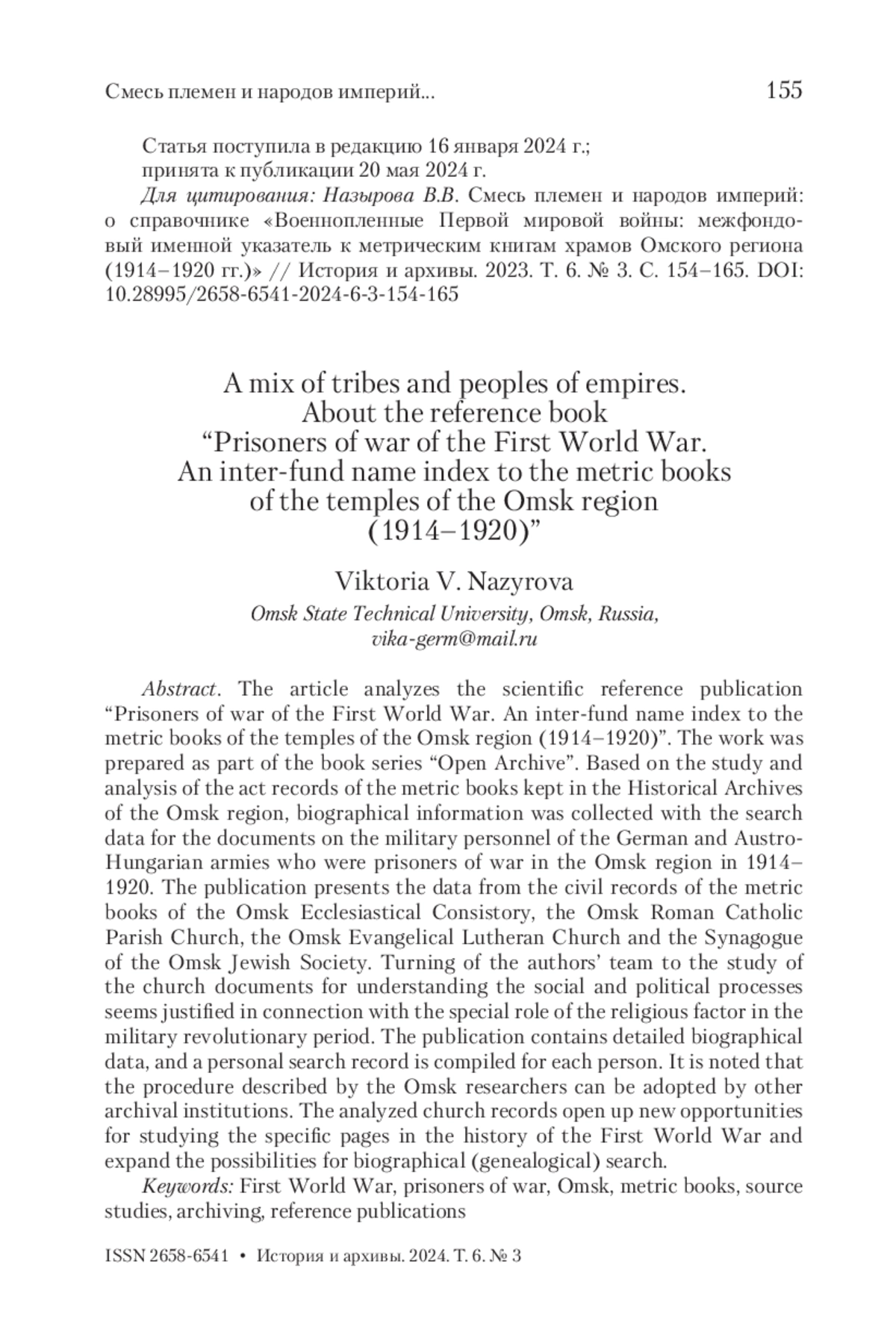 В статье анализируется научно-справочное издание «Военнопленные Первой мировой войны: межфондовый именной указатель к метрическим книгам храмов Омского региона (1914–1920 гг.)». Работа подготовлена в рамках книжной серии «Открытый архив». На основе изучения и анализа актовых записей метрических книг, хранящихся в Историческом архиве Омской области, были собраны сведения биографического характера с поисковыми данными к документам о военнослужащих германской и австро-венгерской армий, находившихся в 1914–1920 гг. в статусе военнопленных на территории Омского региона. В издании представлены данные из актовых записей метрических книг Омской духовной консистории, Омского римско-католического приходского костела, Омской евангелическо-лютеранской церкви и синагоги Омского еврейского общества. Обращение авторского коллектива к изучению церковных документов для осмысления социальных и политических процессов выглядит обоснованно в связи с особой ролью религиозного фактора в военно-революционный период. В издании детально прописаны выявленные биографические данные, и на каждого человека составлена персональная поисковая запись. Отмечается, что описанный омский опыт может быть перенят другими архивными учреждениями. Проанализированные церковные актовые записи открывают новые возможности для изучения отдельных страниц истории Первой мировой войны и расширяют возможности для биографического (генеалогического) поиска.