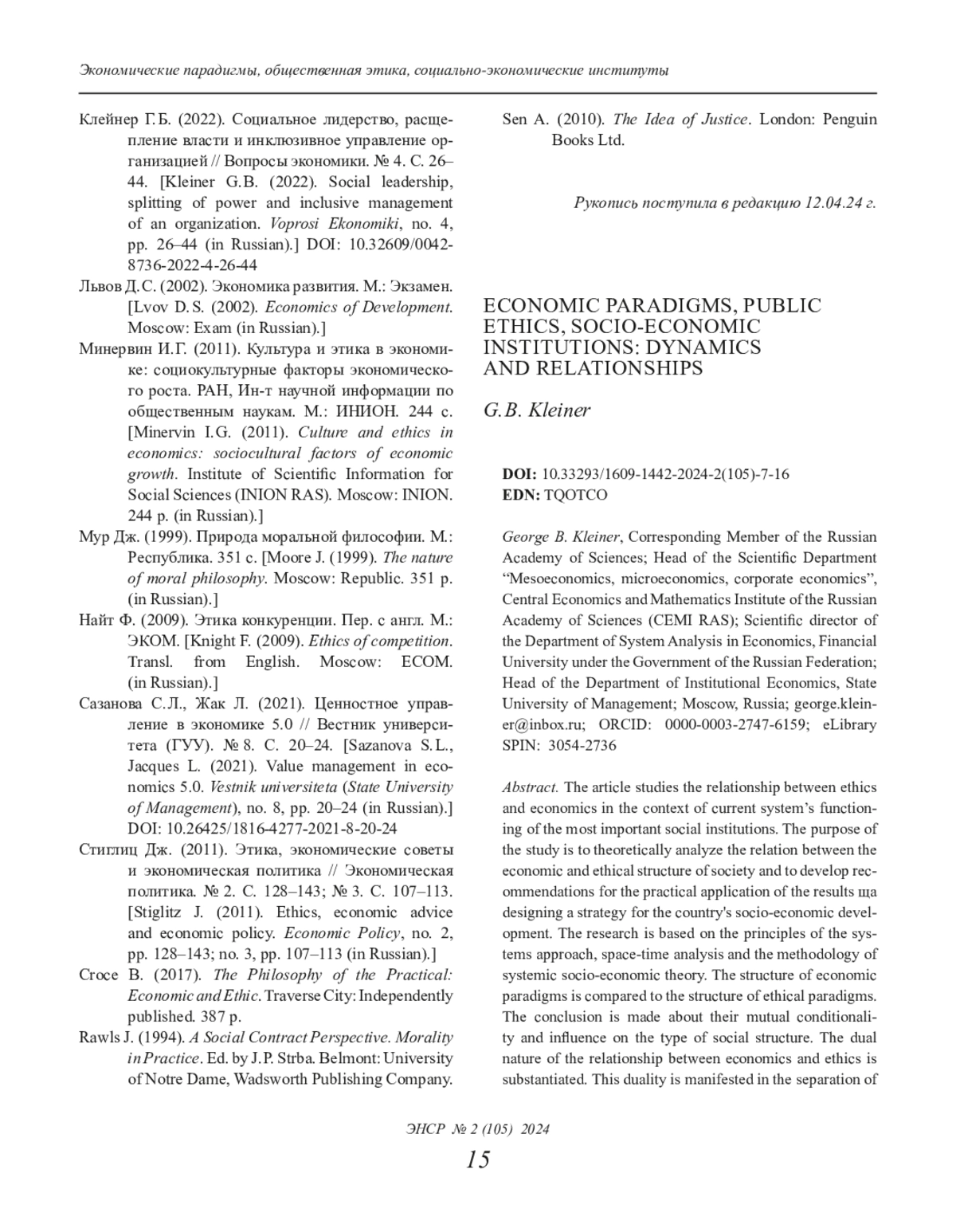 1. Ивашковский С. (2011). Экономика и этика: история непростых взаимоотношений // Экономическая политика. № 3. С. 114-141. EDN: NULJZL