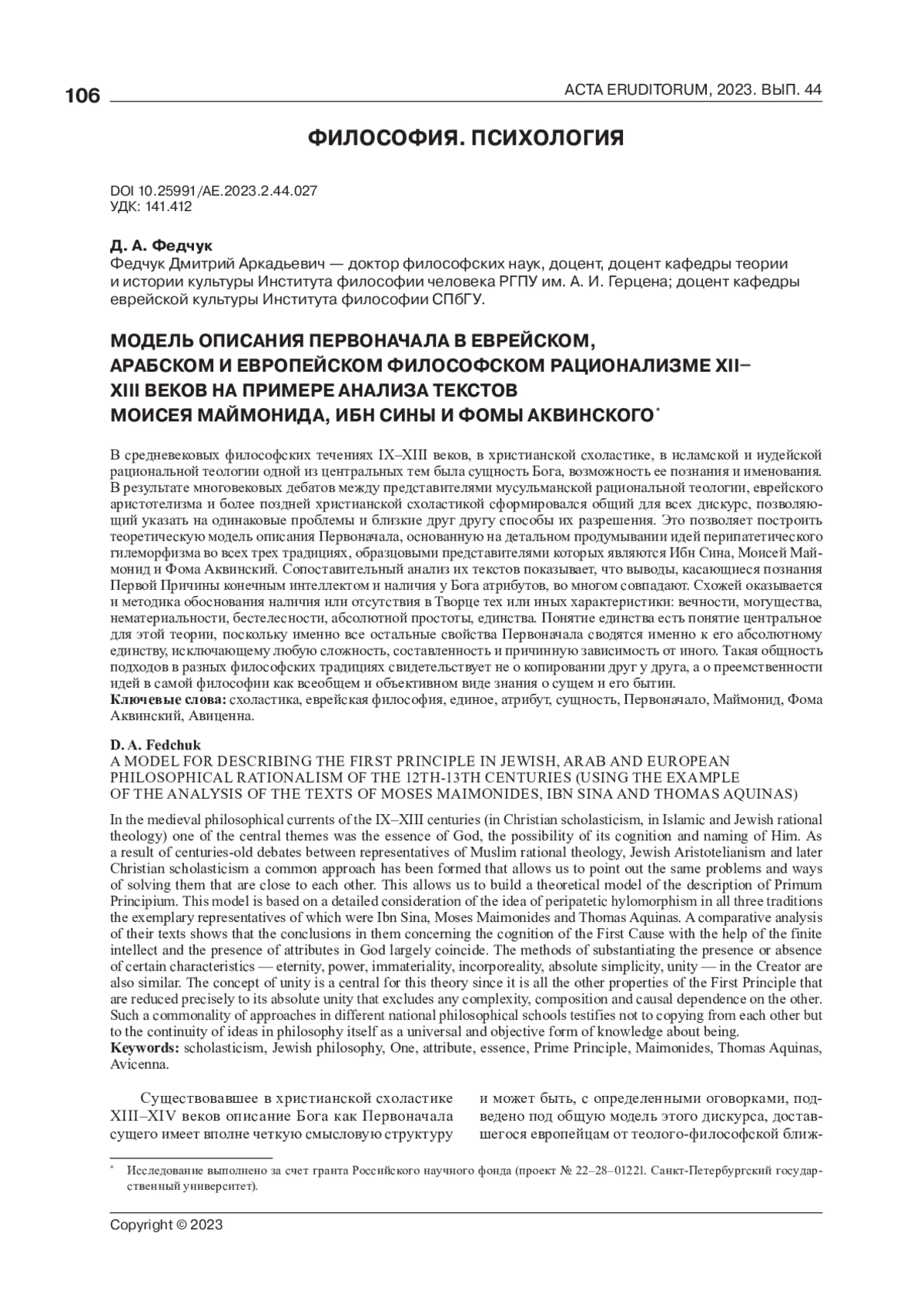 В средневековых философских течениях IX-XIII веков, в христианской схоластике, в исламской и иудейской рациональной теологии одной из центральных тем была сущность Бога, возможность ее познания и именования. В результате многовековых дебатов между представителями мусульманской рациональной теологии, еврейского аристотелизма и более поздней христианской схоластикой сформировался общий для всех дискурс, позволяющий указать на одинаковые проблемы и близкие друг другу способы их разрешения. Это позволяет построить теоретическую модель описания Первоначала, основанную на детальном продумывании идей перипатетического гилеморфизма во всех трех традициях, образцовыми представителями которых являются Ибн Сина, Моисей Маймонид и Фома Аквинский. Сопоставительный анализ их текстов показывает, что выводы, касающиеся познания Первой Причины конечным интеллектом и наличия у Бога атрибутов, во многом совпадают. Схожей оказывается и методика обоснования наличия или отсутствия в Творце тех или иных характеристики: вечности, могущества, нематериальности, бестелесности, абсолютной простоты, единства. Понятие единства есть понятие центральное для этой теории, поскольку именно все остальные свойства Первоначала сводятся именно к его абсолютному единству, исключающему любую сложность, составленность и причинную зависимость от иного. Такая общность подходов в разных философских традициях свидетельствует не о копировании друг у друга, а о преемственности идей в самой философии как всеобщем и объективном виде знания о сущем и его бытии.