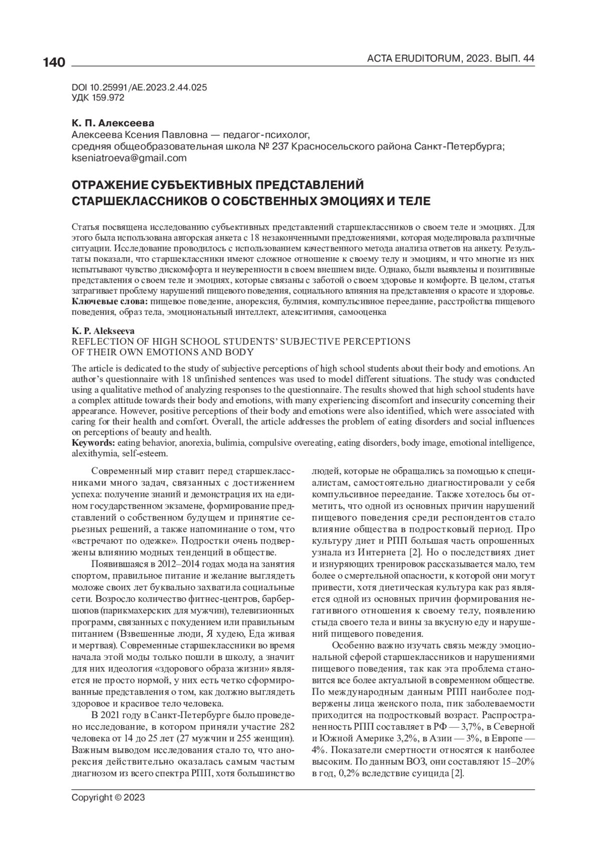 Статья посвящена исследованию субъективных представлений старшеклассников о своем теле и эмоциях. Для этого была использована авторская анкета с 18 незаконченными предложениями, которая моделировала различные ситуации. Исследование проводилось с использованием качественного метода анализа ответов на анкету. Результаты показали, что старшеклассники имеют сложное отношение к своему телу и эмоциям, и что многие из них испытывают чувство дискомфорта и неуверенности в своем внешнем виде. Однако, были выявлены и позитивные представления о своем теле и эмоциях, которые связаны с заботой о своем здоровье и комфорте. В целом, статья затрагивает проблему нарушений пищевого поведения, социального влияния на представления о красоте и здоровье.