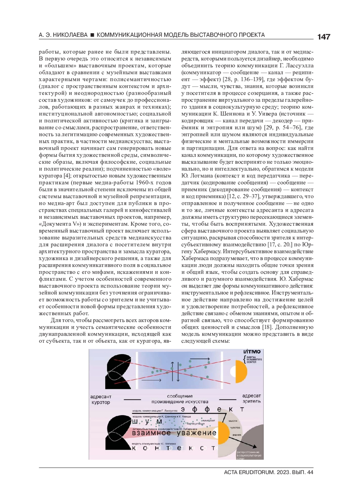 Классическая аристотелевская модель коммуникации, принятая в социальных науках, состоит из трёх элементов: адресанта - сообщения - адресата. В контексте выставочного проекта, как уникального культурного события и новой формы репрезентации художественного, коммуникационная модель может быть выражена через триаду: куратор - произведение искусства - зритель. В центре внимания - выставочный проект как поле для возможных экспериментов охватывает совокупность смыслов, символические и визуальные проявления современной художественной среды, а также формирует коммуникативное поле, требуя от зрителя особого опыта восприятия и осмысления. Медиатехнологии становятся одним из каналов для вовлечения и взаимодействия с посетителем в таких современных выставочных проектах, как выставка-путешествие «Балабанов», «Психотерапевт для искусственного интеллекта» и «Первая позиция. Русский балет». Автор рассматривает приведённые выставки со следующих позиций: принципы применения медиатехнологий, их воздействие на зрителя и коммуникативный потенциал.