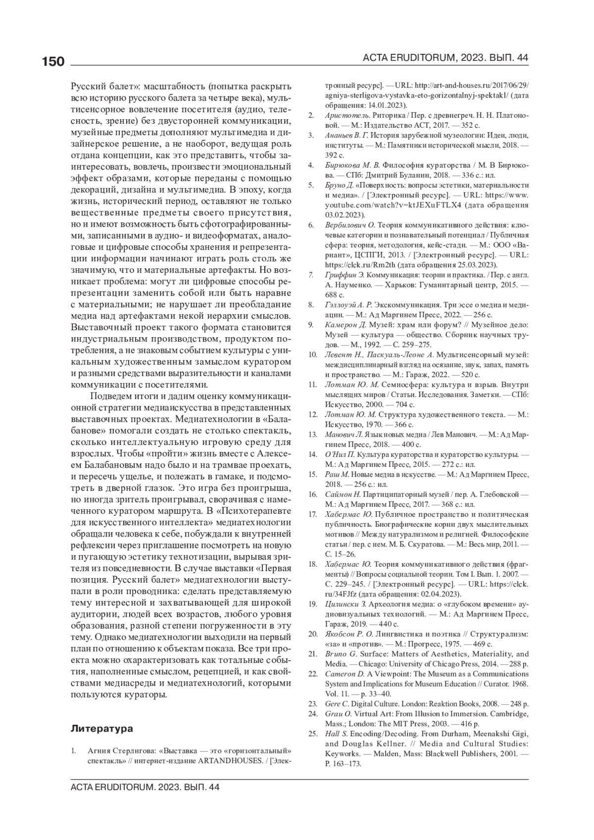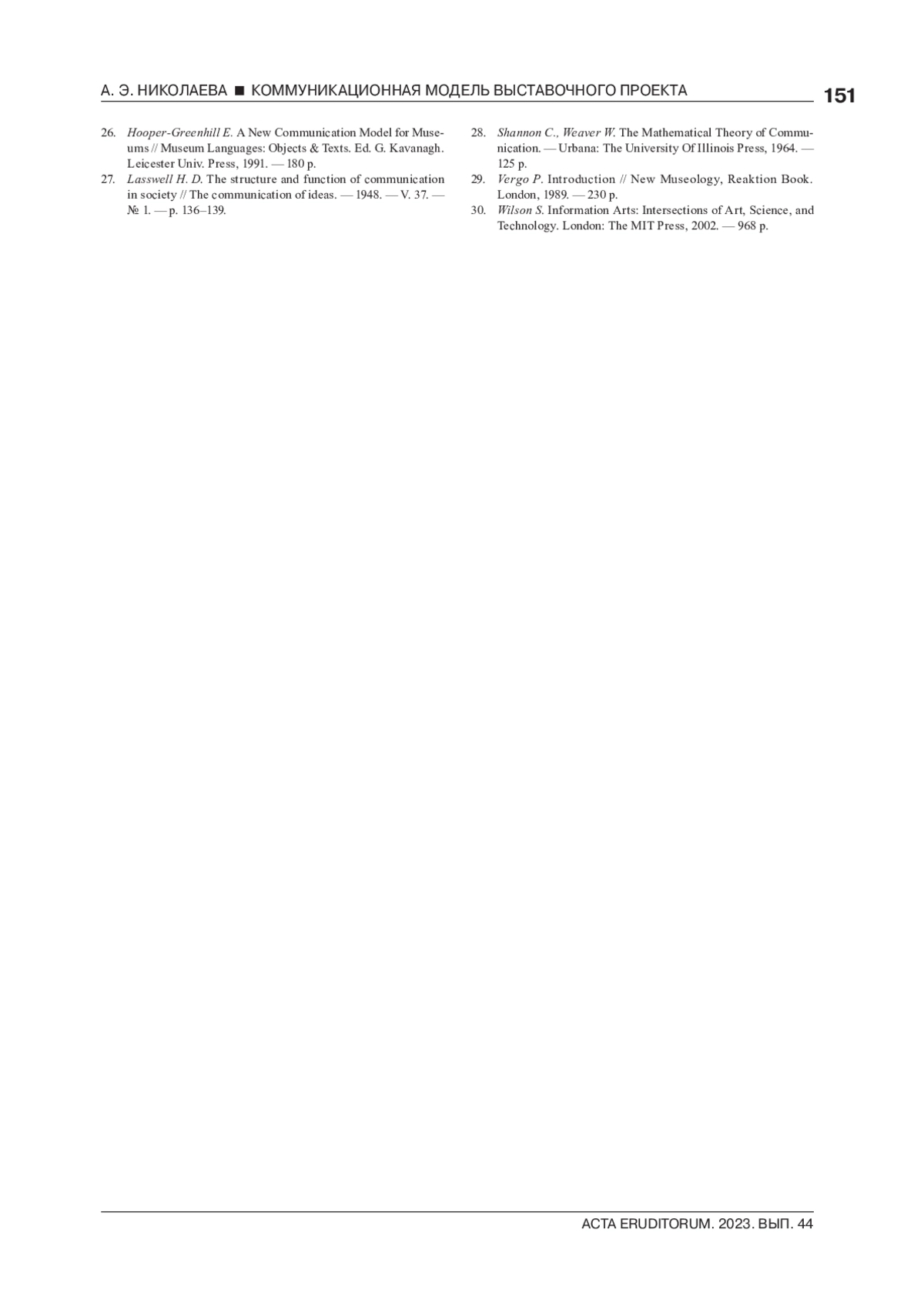 26. Hooper-Greenhill E. A New Communication Model for Museums // Museum Languages: Objects & Texts. Ed. G. Kavanagh. Leicester Univ. Press, 1991. - 180 p.