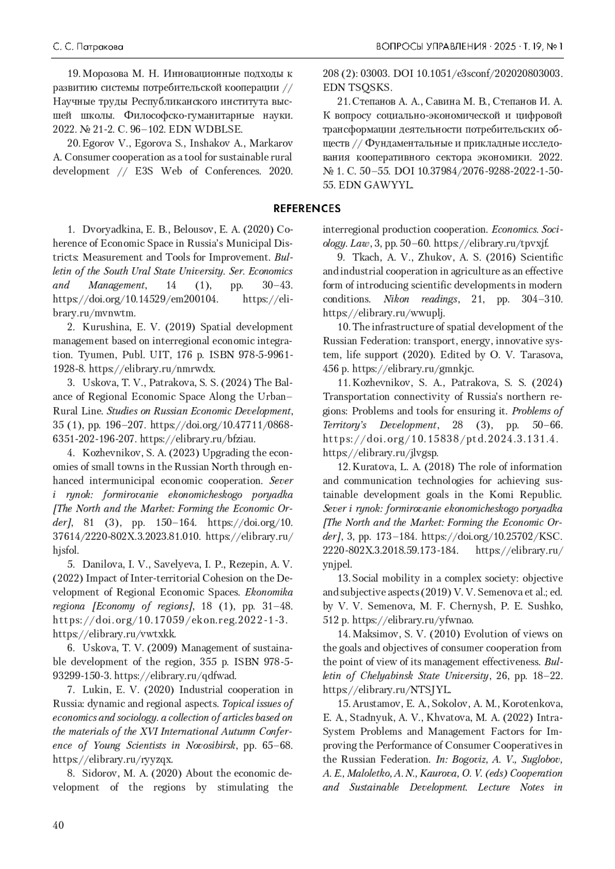 3. Ускова Т. В., Патракова С. С. Сбалансированность регионального экономического пространства по линии “город - село” // Проблемы прогнозирования. 2024. № 1. С. 196-207. DOI: 10.47711/0868-6351-202-196-207 EDN: BFZIAU