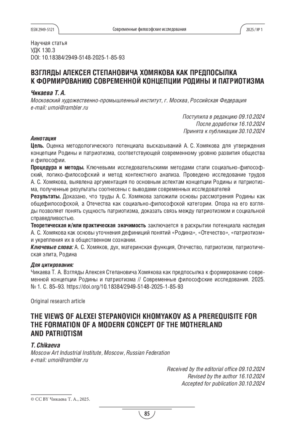 Цель. Оценка методологического потенциала высказываний А. С. Хомякова для утверждения концепции Родины и патриотизма, соответствующей современному уровню развития общества и философии.